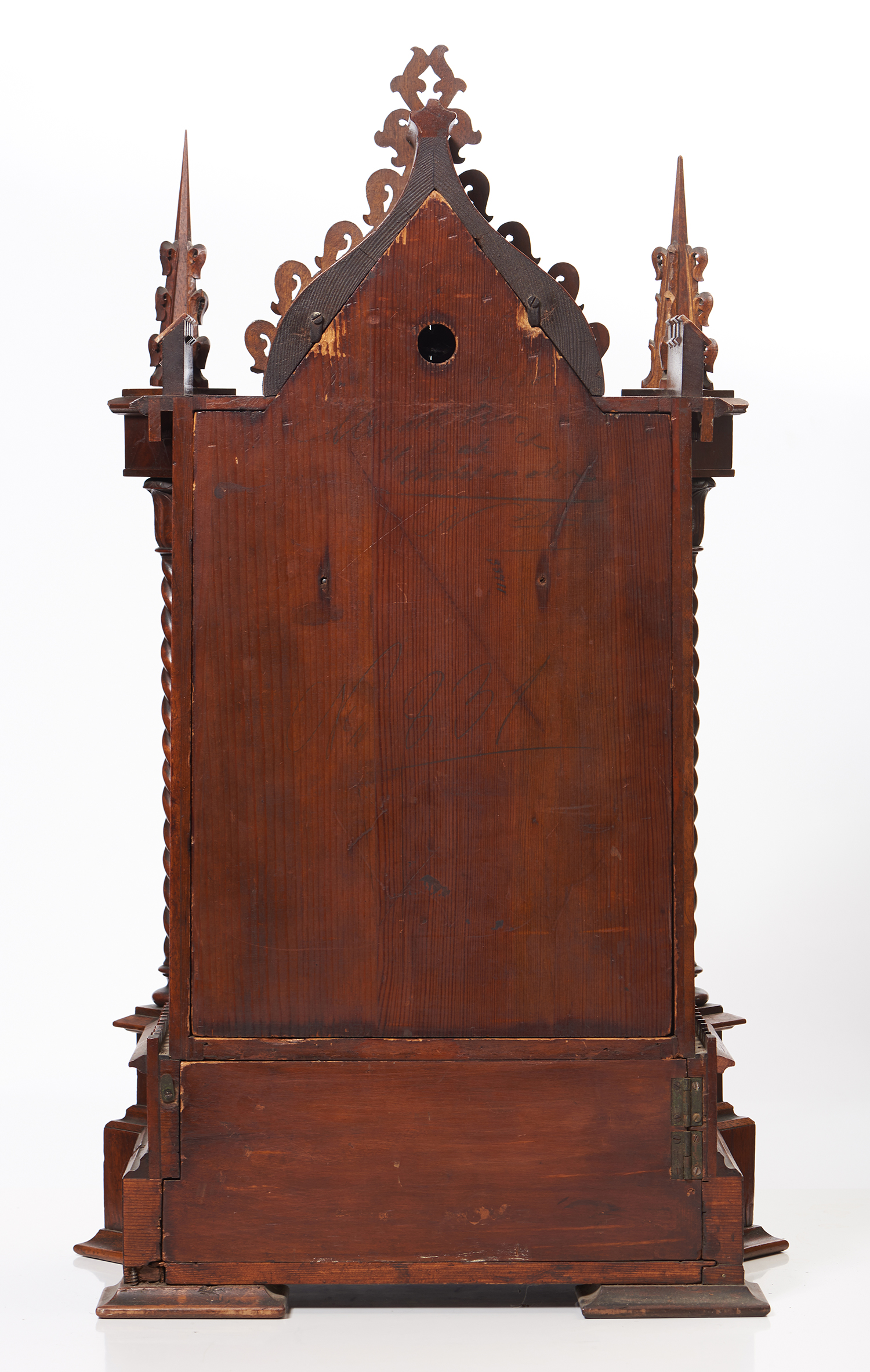 Oak gothic style case, with two mechanical figures on top of clock striking bells for quarters/hours striking cuckoo and music box in base. Three train eight day movement