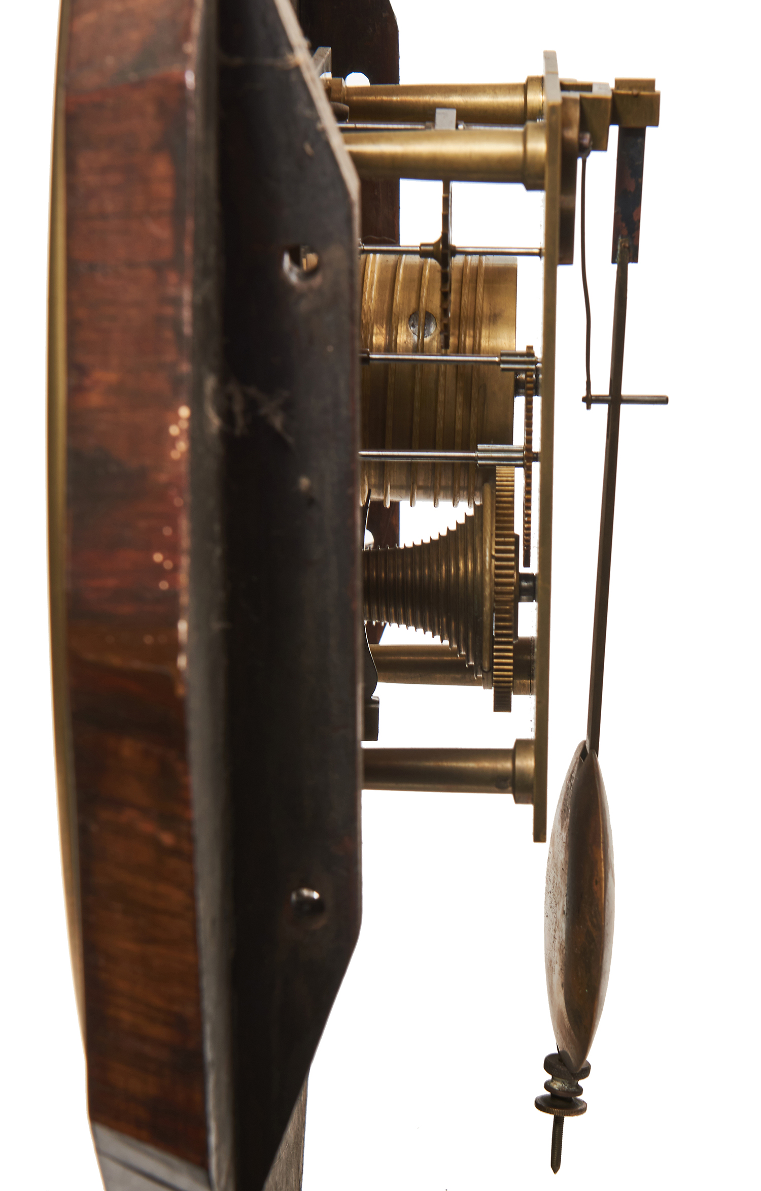 Twelve sided mahogany case with rectangular box behind secured to the bezel with four tapered wooden pegs. Circular 30.5 cm diameter painted dial with Roman numerals, and signed Cutmore- St Ann's Lane St Martin's Le Grand- City. Winding hole below centre arbour, anchor escapement with heavy flattened brass pendulum. Eight day gong.