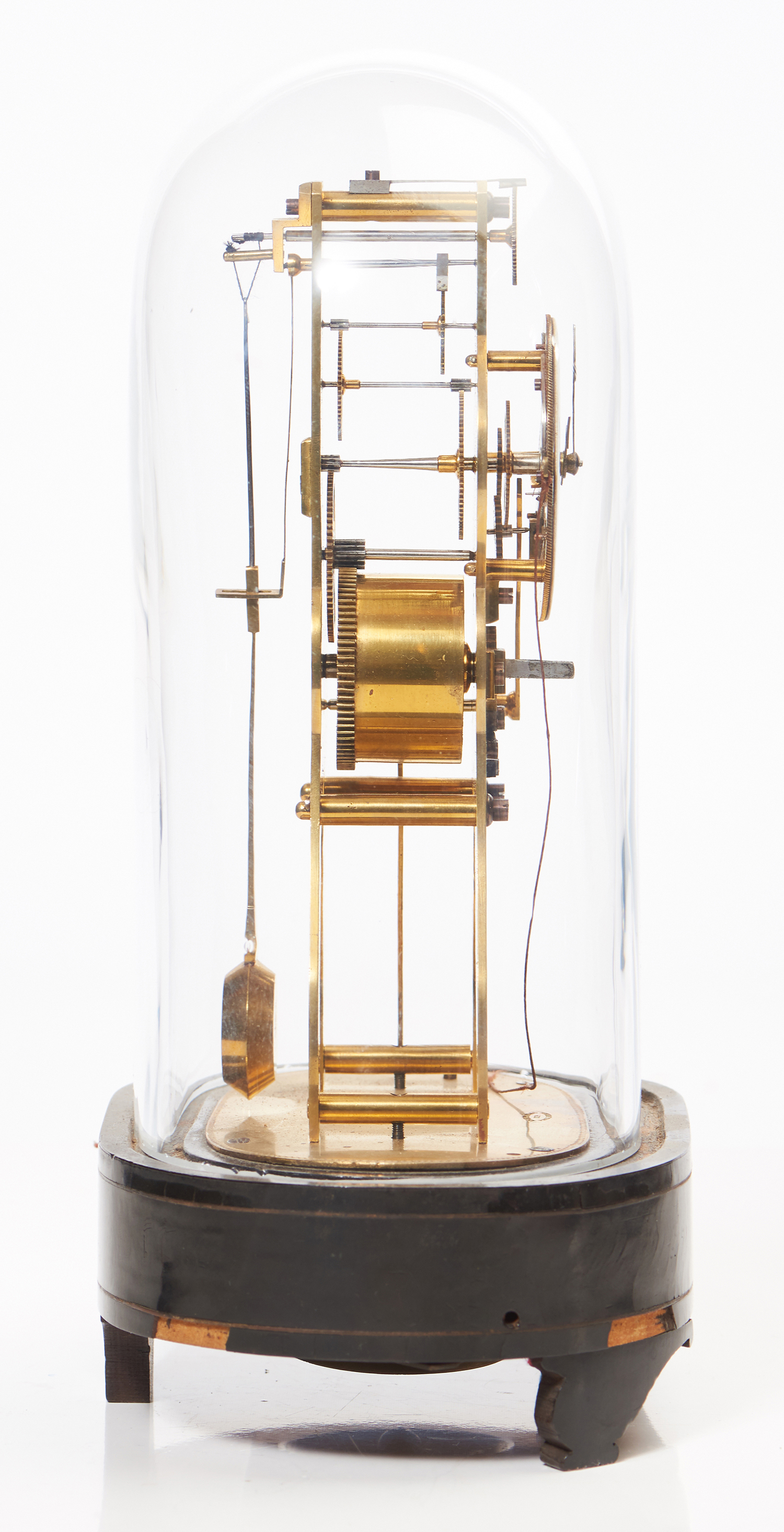 The porcelain dial above engraved plates, raised on an ebonised base. Alarm time/alarm with bell to base and a silk suspension pendulum. Encased under a glass dome