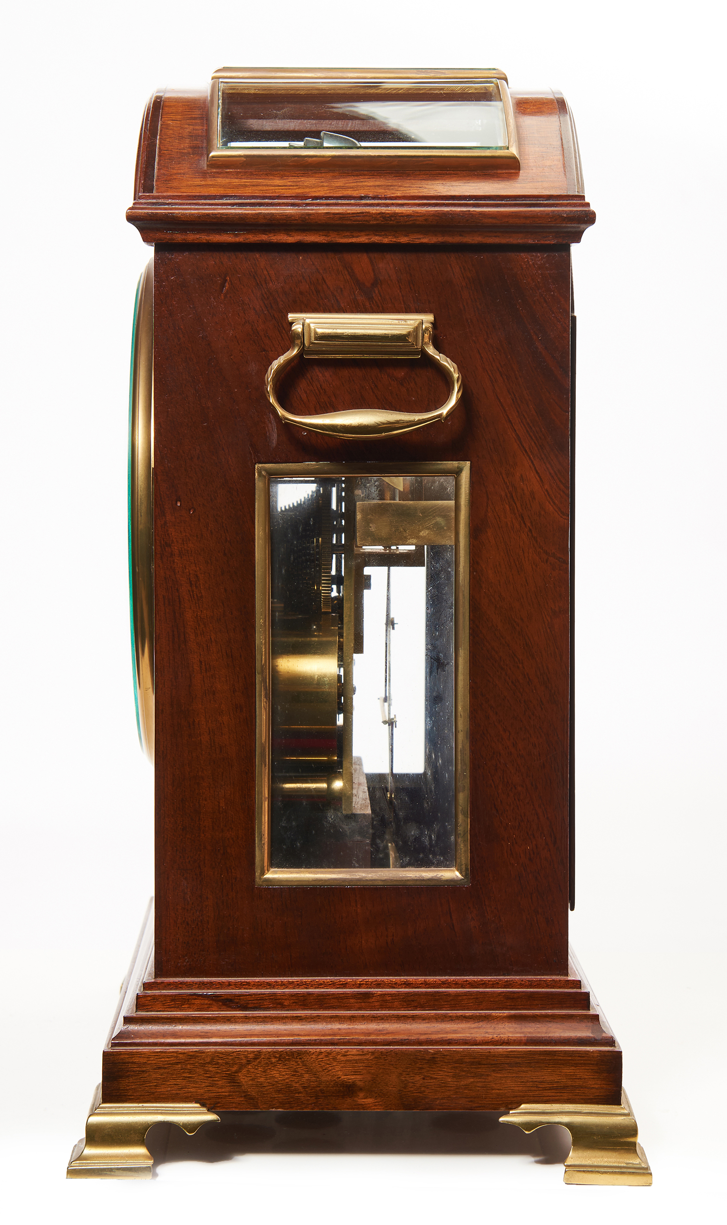 The break arch case with three brass trimmed rectangular glass panels set into the top of the arch. Circular cast brass bezel with brass inset panels above the dial and two brass inset panels below dial. Brass carrying handles to each side above brass bound glass side panels. The moulded base on brass bracket feet. The circular silvered brass dial with seconds dial above centre arbour having engraved Roman numerals. The three train fusee movement with deadbeat escapement, maintaining power is of eight day duration, quarter chiming on eight bells with two tunes selected at rear. With rhomboid pendulum
