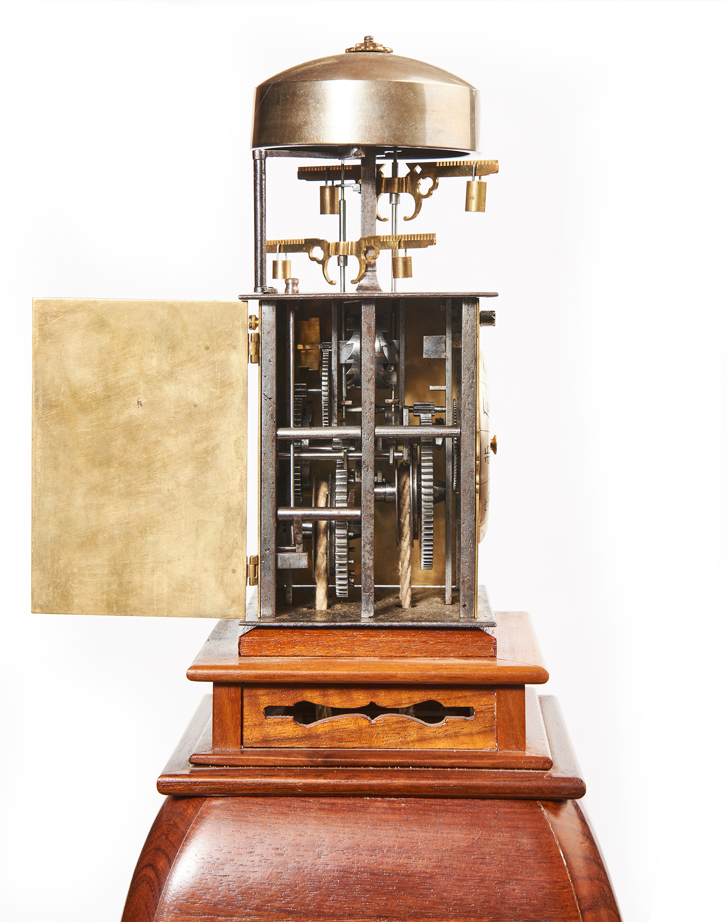 The rectangular wooden case glazed to four sides, solid top, mounted on cabriole legged stand. The brass and iron Yagura-Dokei, with regular iron posts to four corners, the case with side and rear panels with engraved decoration. The front panel with silver convex chapter ring, central alarm disc with well pierced blue steel hand. The two train weight driven movement with double foliot to the verge escapement