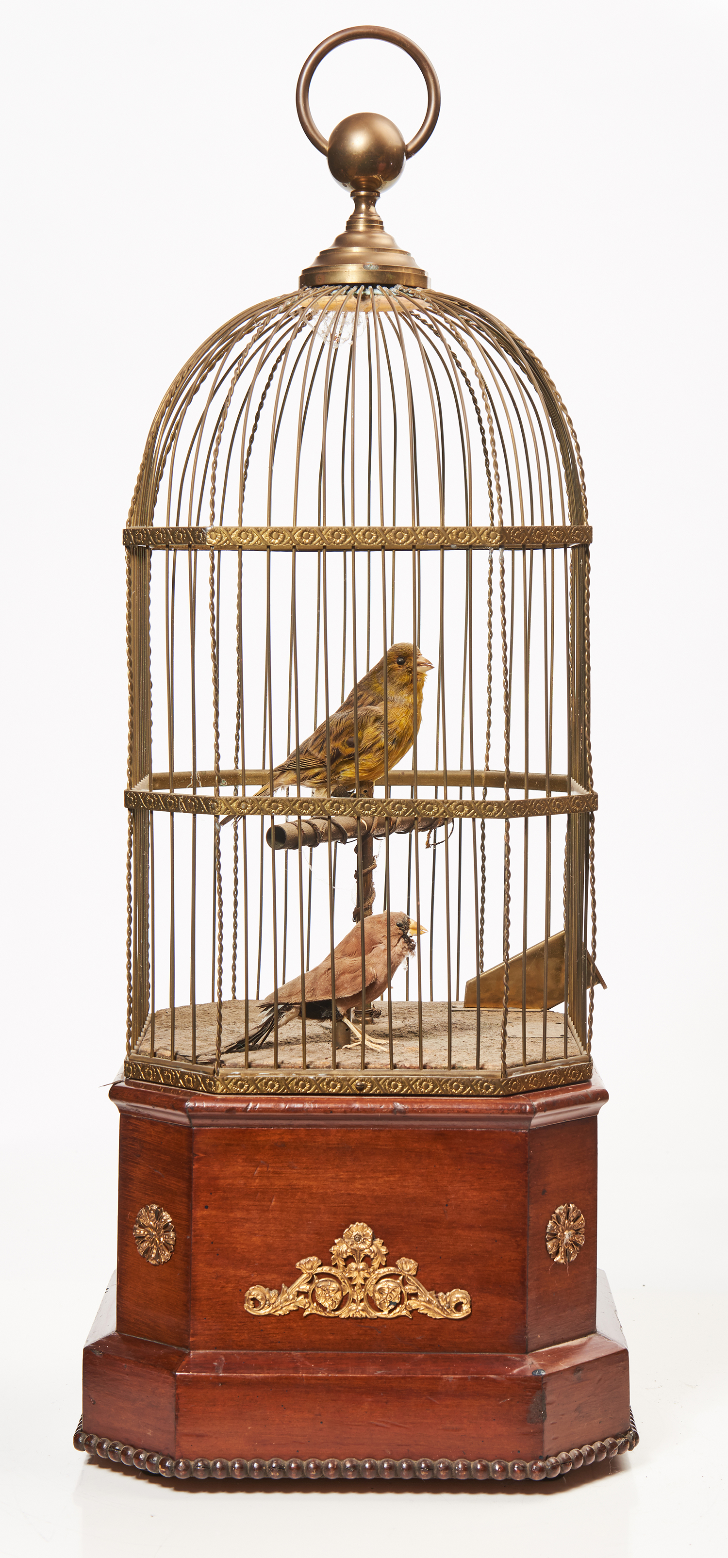 working, not recently serviced. case re-polished and re-gilded. Birds showing signs of age and deterioration. Feathers loose. discolouration and repairs to base in places