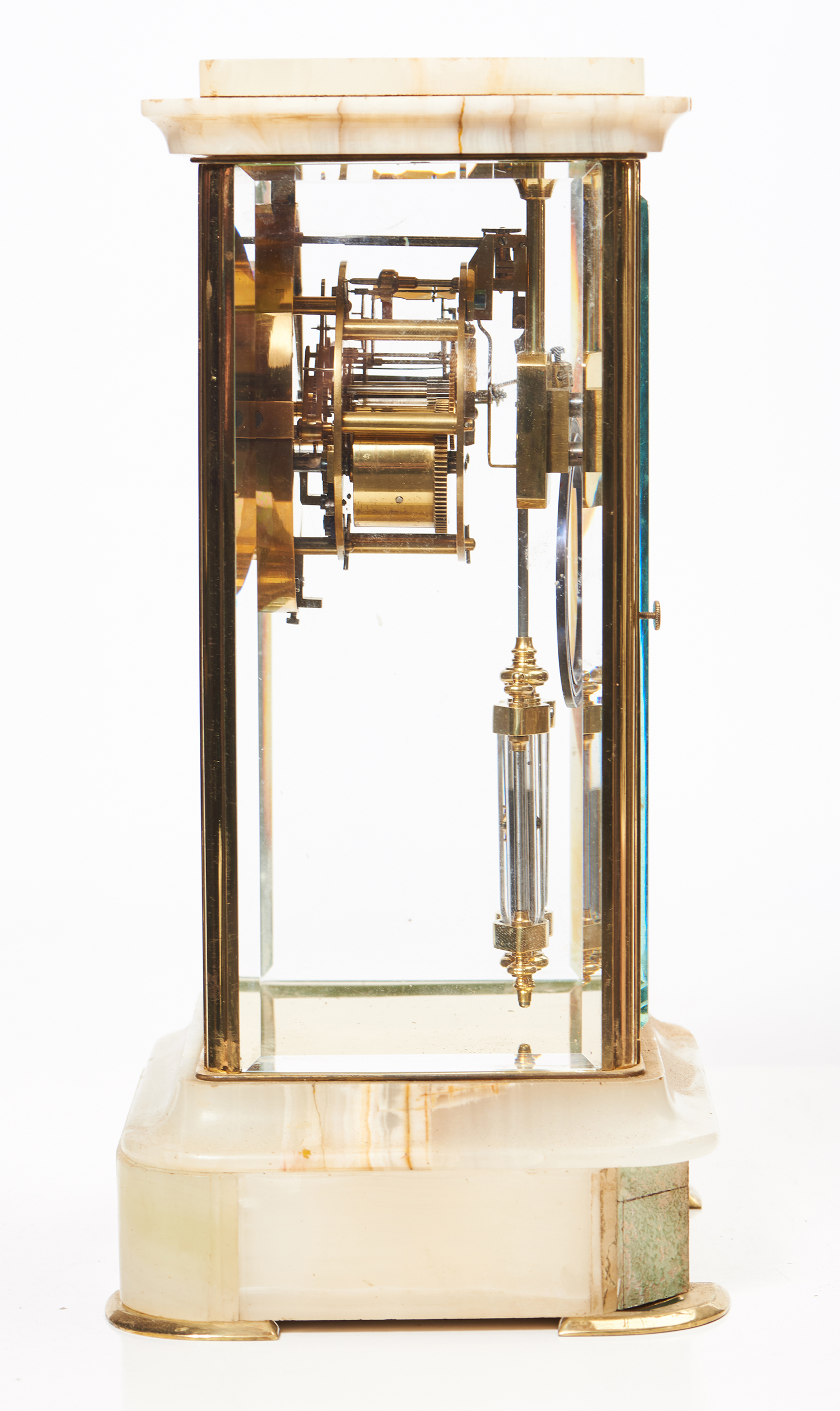 The four thick bevel edge glass panels with an alabaster base and top. The gilt dial with an alabaster centre. Eight day movement, striking on gong. Twin tube mercury pendulum