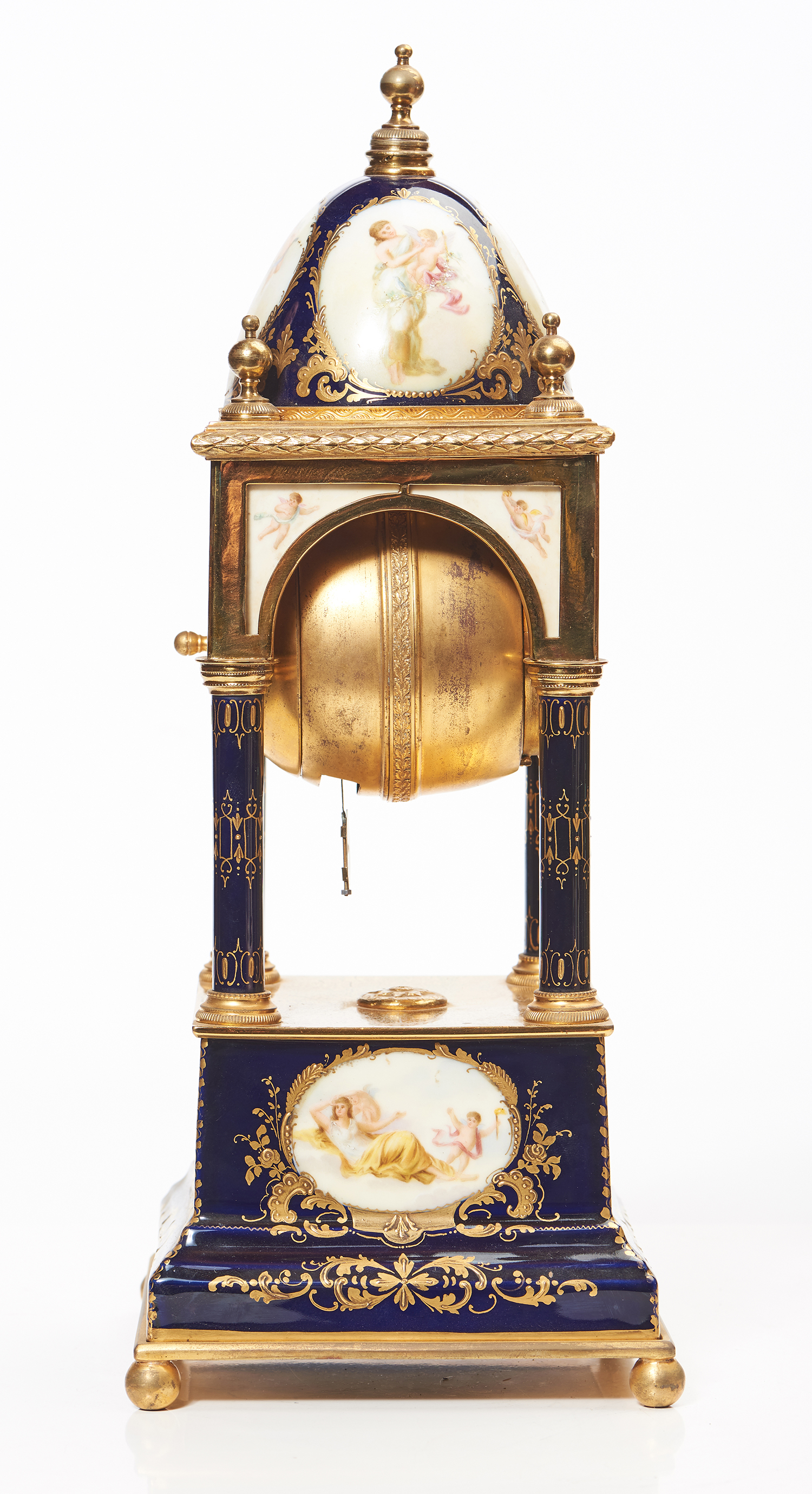 The cobalt blue porcelain ground case hand painted with romantic scenes of ladies and cherubs. Time only