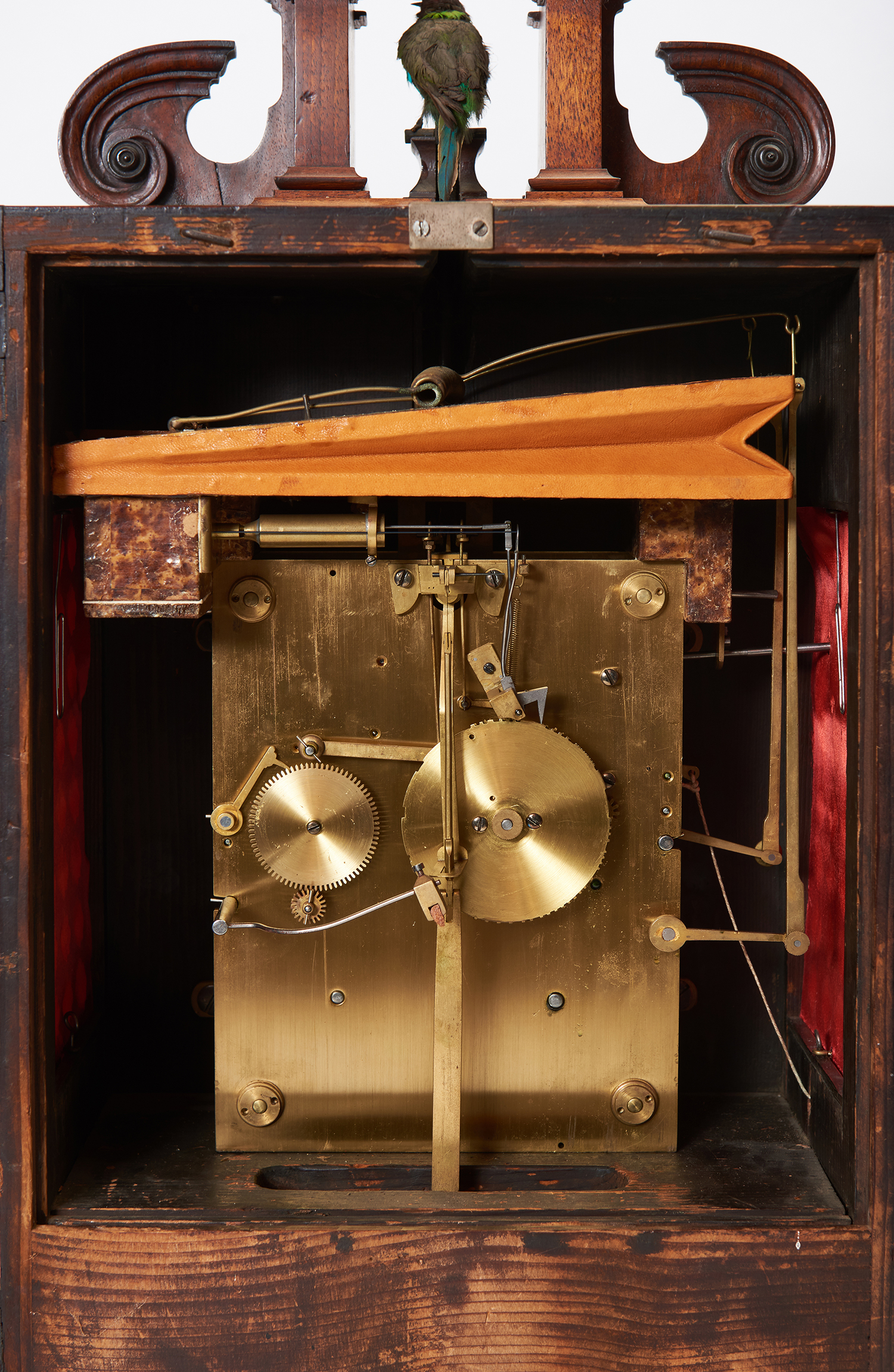 Wood case with silvered fretted panels to base, dial surround and dial centre, all with gilded backing plates. Singing bird is mounted on top of case in a wooden arch. Three train, brass plate movement striking on gong. Singing bird is manually operated by a pull rod through side of case.