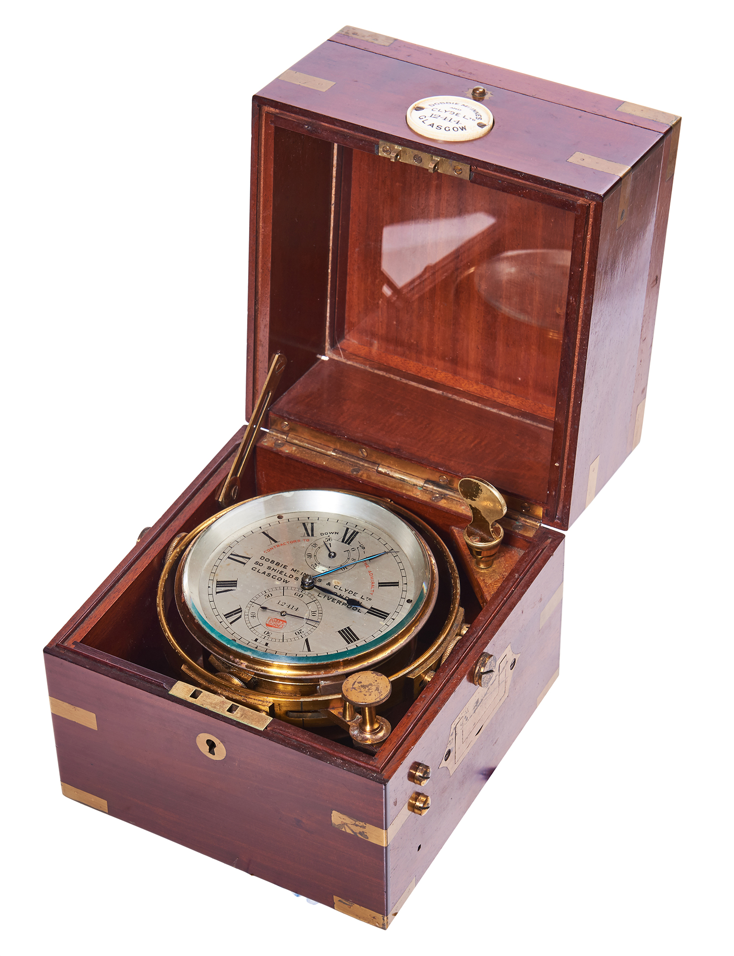 Brass banded and gimbled mahogany box, The outer mahogany deck watch box with leather strap. The dial signed and numbered 12414