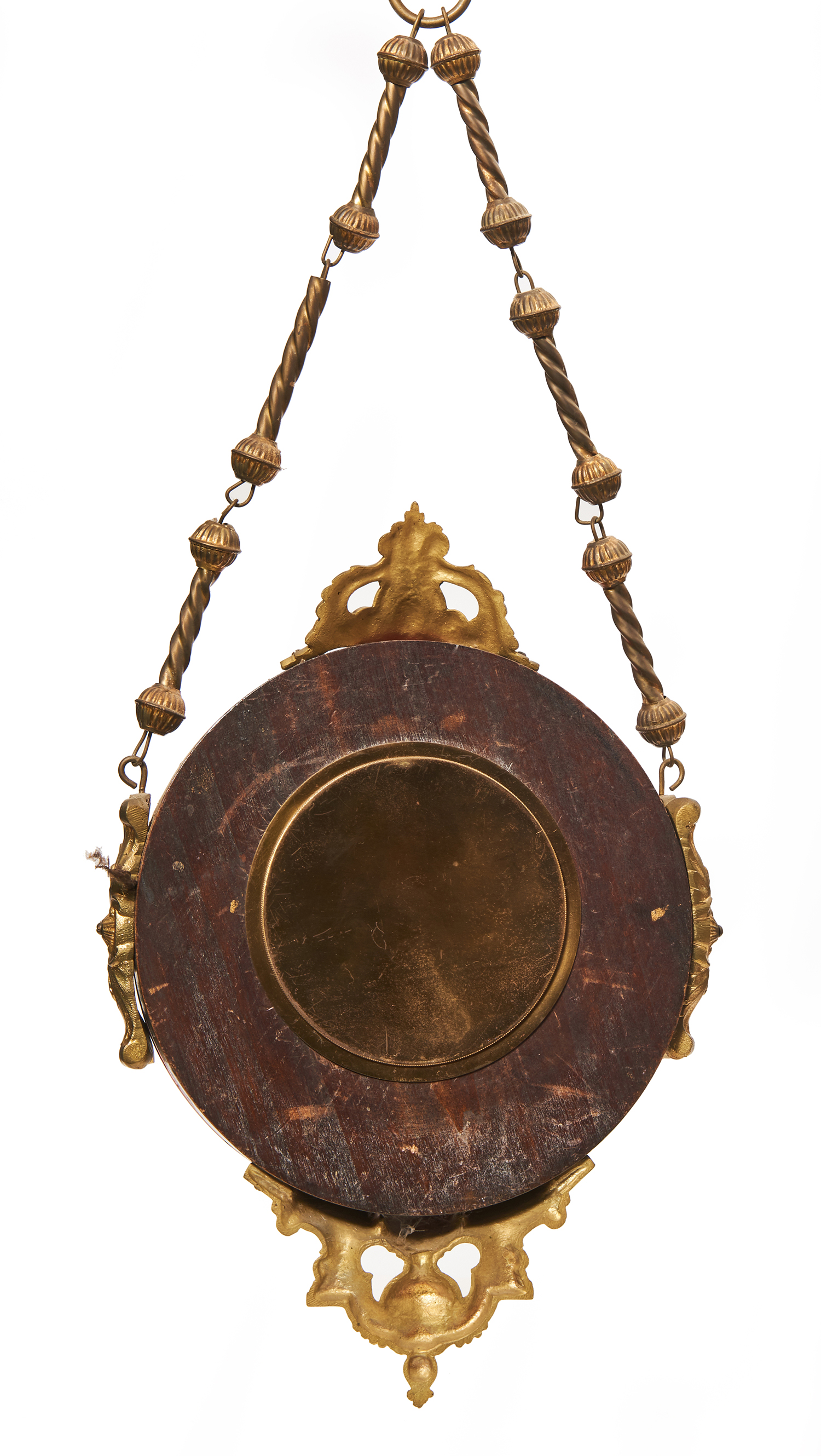The maroon porcelain framed clock suspended by metal chain. The dial with Arabic numerals, time only.