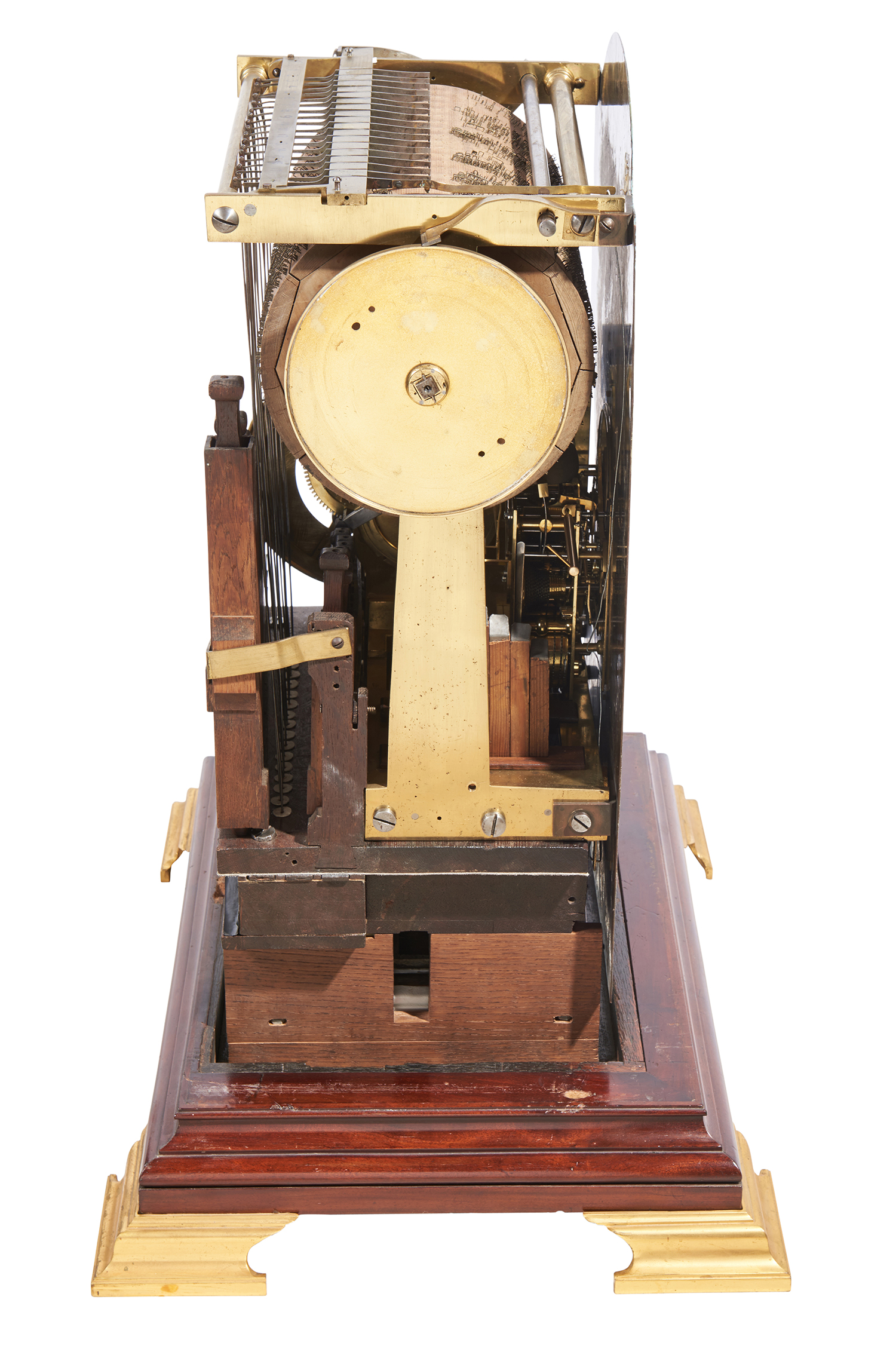 The large mahogany bell topped case with five gilt brass urn finials at each corner of the case and one located centrally on small reeded plinth. The case with full length pierced side frets with a pair of pierced gilt brass sound frets to the top corners of arched front door. Stop fluted front corners to full height door. Moulded vase supported on gilt brass feet. The arched painted dial with allegorical scenes and automotive figures operated by movement. A smaller break arch, silver framed dial located centrally in the painted dial. The clock with Roman and Arabic chapter ring framed by silver mounts and pierced door spandrels. Above the chapter ring are two subsidiary dials for rise and fall regulation and pendulum lock. Below centre arbour a curved calendar aperture, engraved day disc in arch. The two train eight day fusee movement with verge escapement and hour, bell striking. The organ plays on seventeen oak stopped pipes plus seventeen octave stopped pipes and seventeen shaded. The organ with 20.8 cm diameter wooden barrel, 30.5 cm long and plays nine tunes. Movement with one speed regulator to the movement and three stop selector slides.