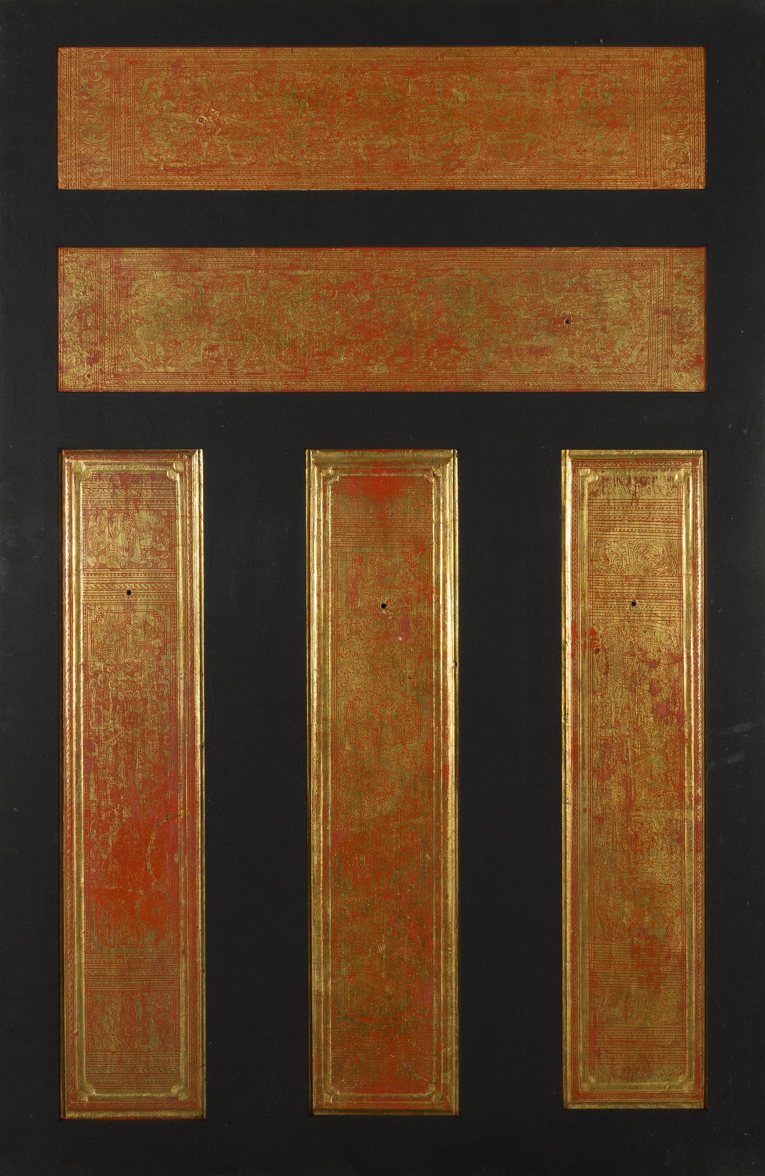 The largest framed group comprising of twelve lacquered and gilt pages, each page bearing six lines of Pali text in deep brown lacquer. One other framed group of three similar lacquer pages, and the last with gilt lacquer end pages and book covers. Kammavaca consisted of rules and instructions for new monks entering monastic life, and were often commissioned by the parents of the young monks as a gift for presentation to the monastery.