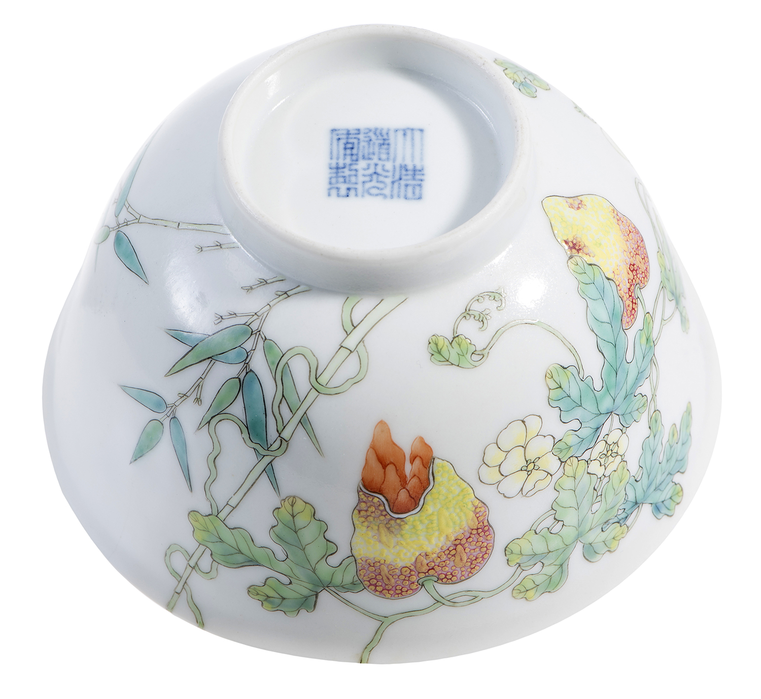 Very finely painted in famille rose enamels to the exterior with a "balsam pear" melon scrolling up a bamboo branch, with a butterfly hovering gently above the flowers, the decoration continuing into the interior. With a six-character mark of Daoguang in underglaze blue to the base.