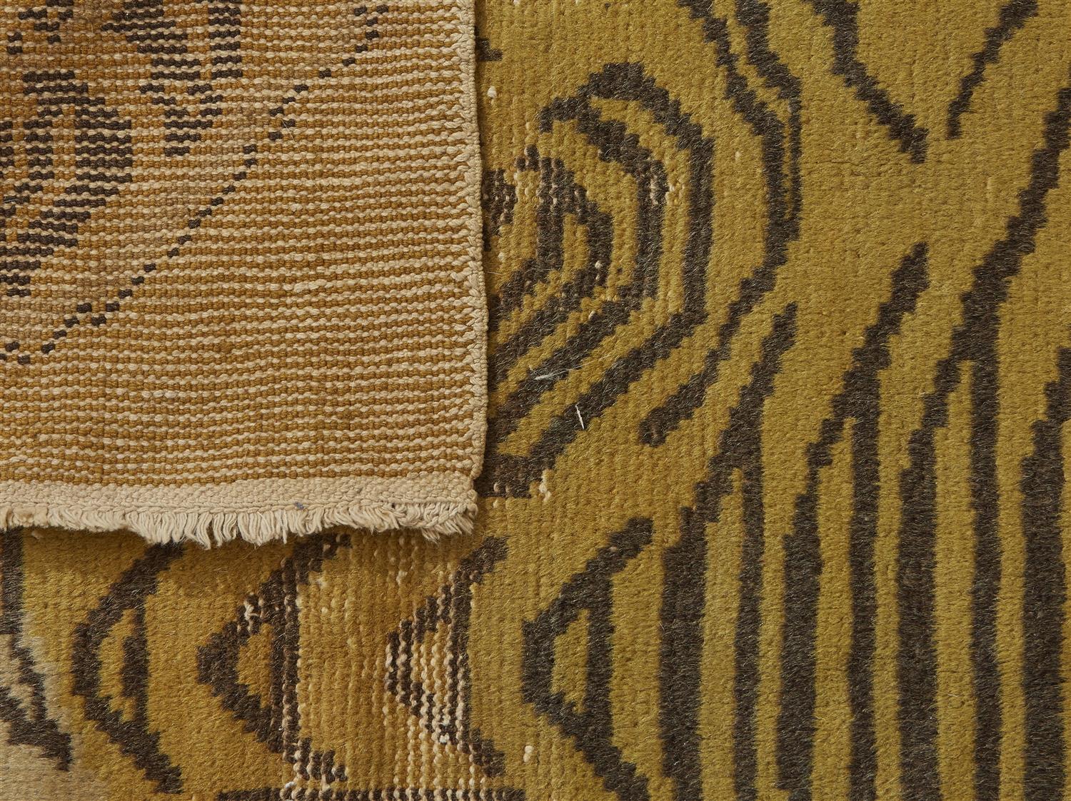 Depicting a flayed tiger pelt in brown wool on a mustard yellow ground.