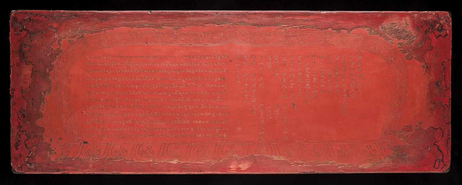 The book cover of incised red lacquer with a Buddhist triple gem to the front. The inner surface extensively inscribed in both Chinese and Tibetan within a flame mandorla on a lotus base.