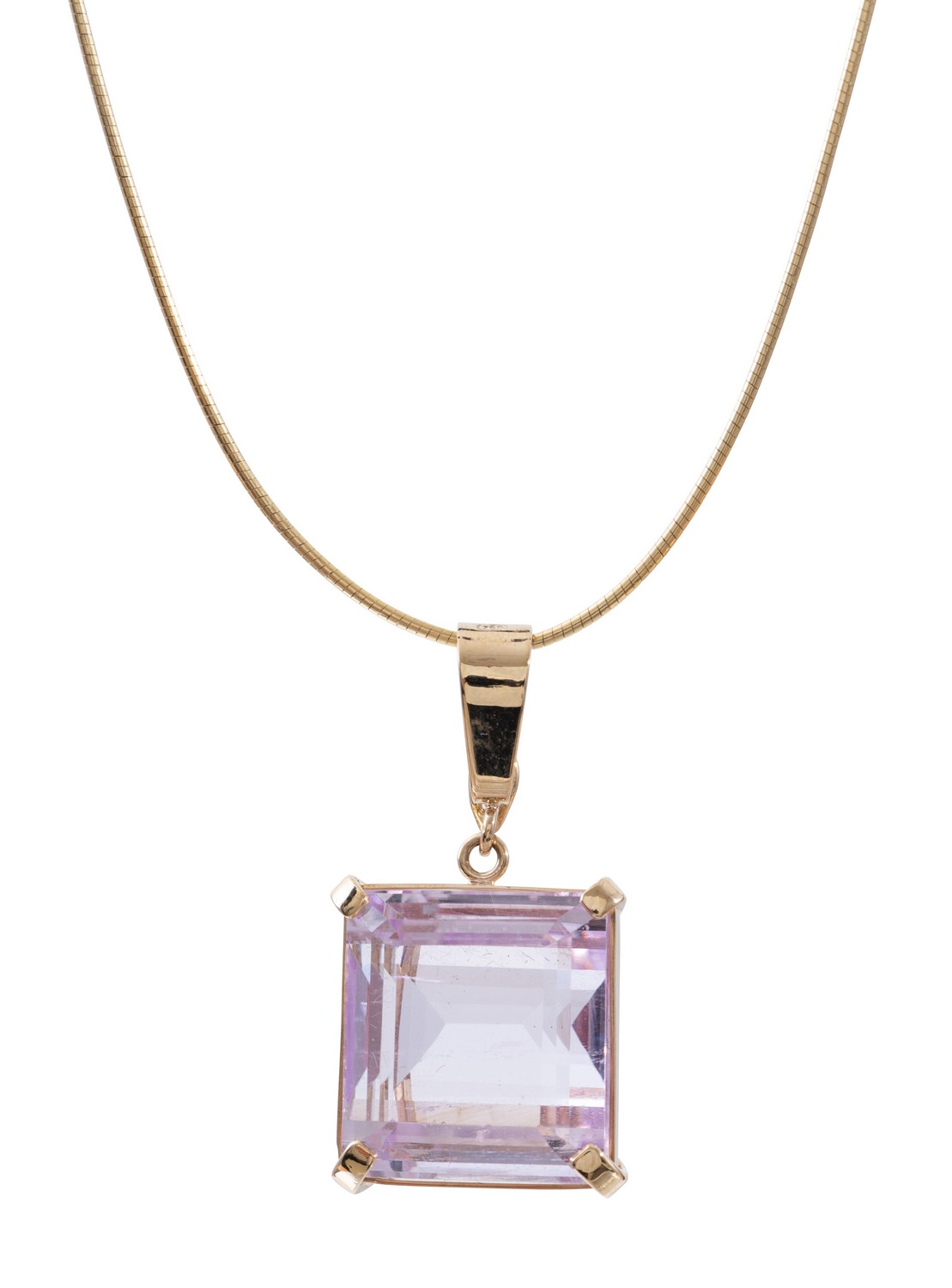 The square cut kunzite weighing 41.67cts, to an enhancer fitting, in 18ct gold, with accompanying GSL gemstone report number AA61352/5, stating natural Spodumene variety Kunzite.