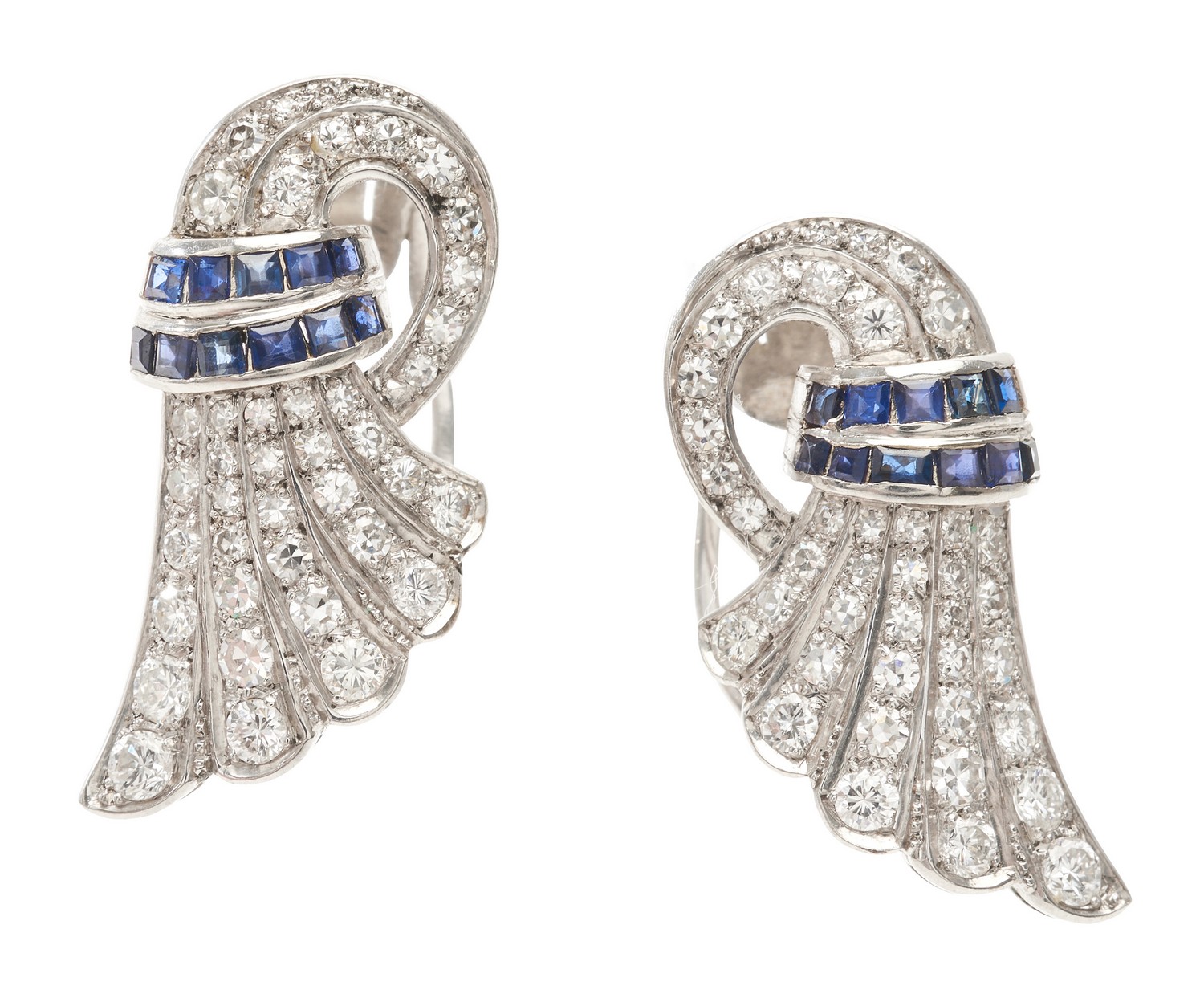 Comprising a pendant of stylised bow design set with a synthetic sapphire cut en cabochon, with single cut diamond and sapphire detail, together with a pair of sapphire and diamond earrings to clip fittings, in platinum.
