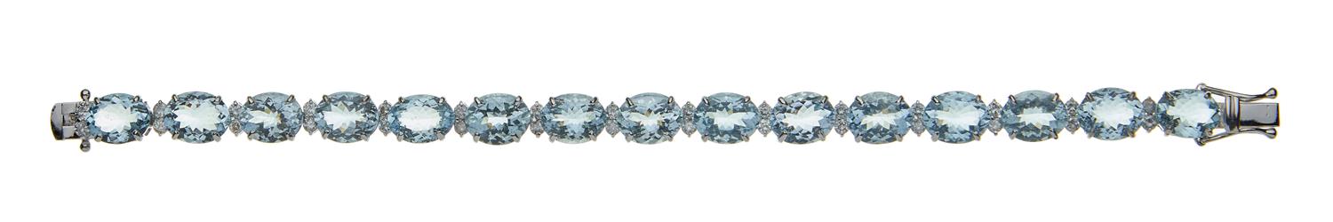 Comprising fifteen oval cut aquamarines totalling 35.80cts, alternating with round brilliant cut diamonds totalling 1.90cts, in 18ct white gold.