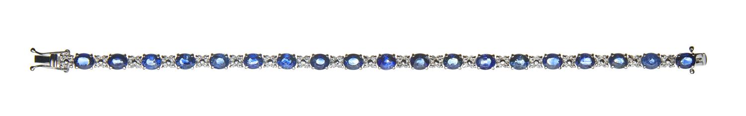 Comprising nineteen oval cut blue sapphires totalling 13.60cts and alternating round brilliant cut diamonds totalling 1.88cts, in 18ct white gold, length 175mm.