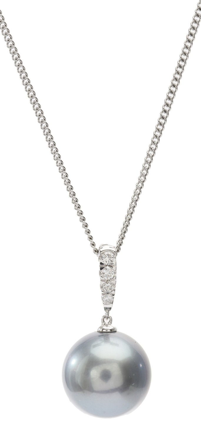 The round pearl of pale grey hues, measuring 14.7mm, suspended below a diamond set bale, in 18ct white gold.
