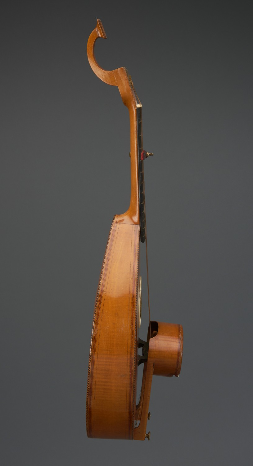 The headstock terminating with a flattened finial. The sound hole rose is an intricately pierced brass disk depicting a courting scene, above a six key ivory keyboard. Ivory inlay to soundhole surround. Housed in box