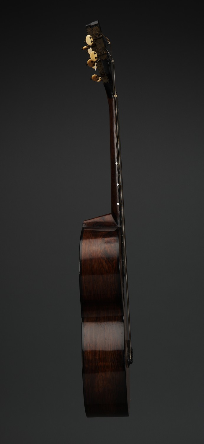 8 string, with fine string inlay to edges and around sound hole. Paper label. Brazilian rosewood veneer to back and sides