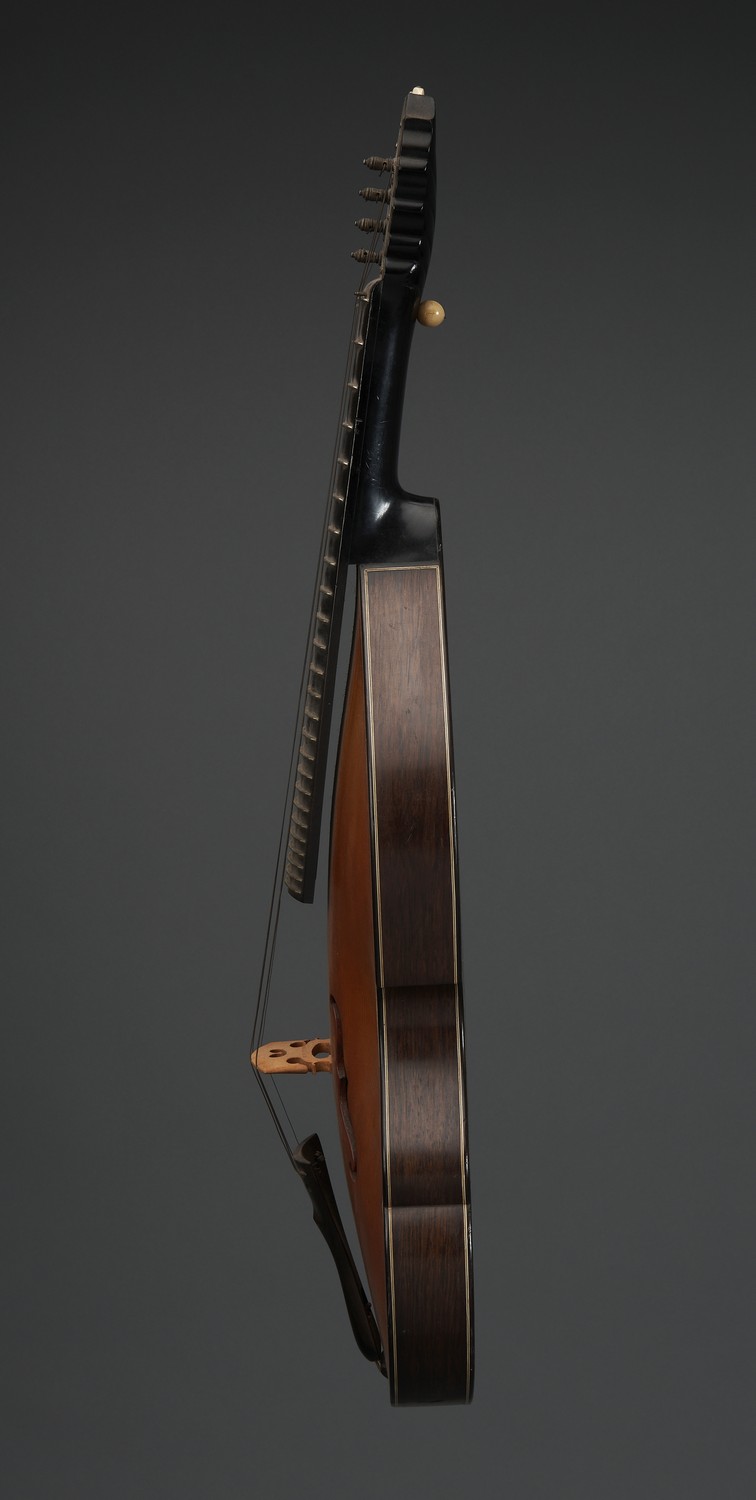 Of typical form, with an ebonised fingerboard and headstock, terminating in the form of an elegantly carved leaf when viewed from the back, to the front 'Henerich Mincher' is engraved on the foliate brass plate on headstock. Housed in old case. Contains Brazilian rosewood.