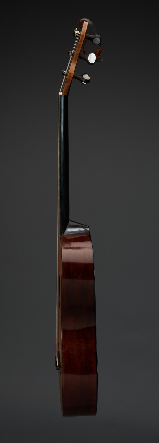 Of typical design with an ebonized neck and fingerboard, friction tuning pegs inlaid with mother-of-pearl, moustache bridge, string inlay banding to the edge of the soundboard and sound hole. Stamped Larousse to interior, in a coffin case. Contains Brazilian rosewood.