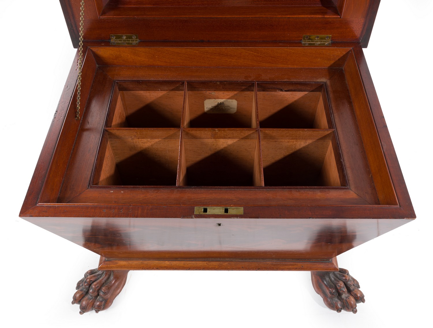 Of sarcophagus form, the hinged top enclosing a fitted interior, raised on carved claw feet. Paper label to interior reading 'Robert Strahan/ Cabinet maker & upholsterer / Auctioneer & undertaker / 24 Henry st'.