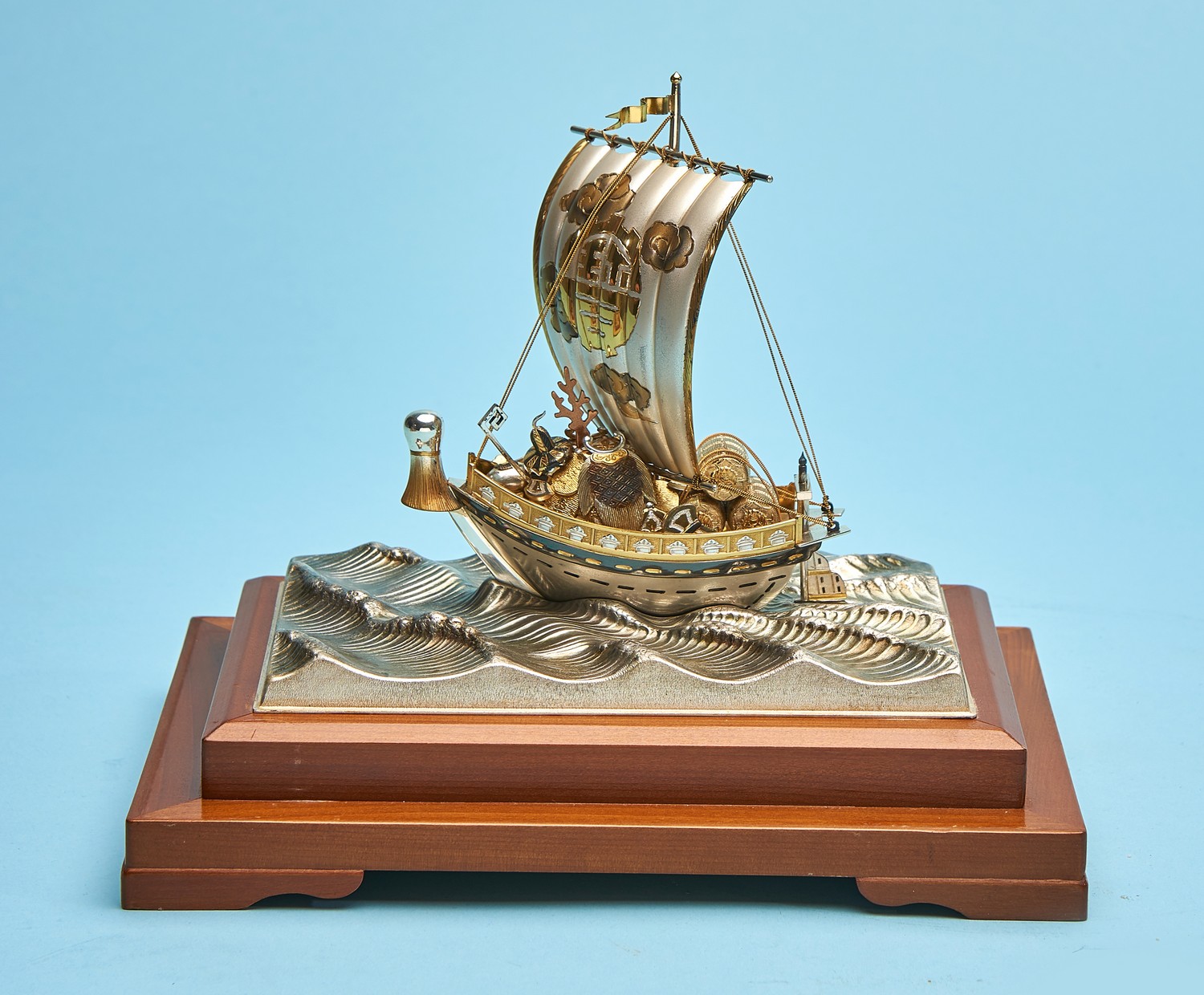 The model boat finely crafted in silver, modelled overflowing with treasures. Housed in a wooden framed display case and accompanied by original box.