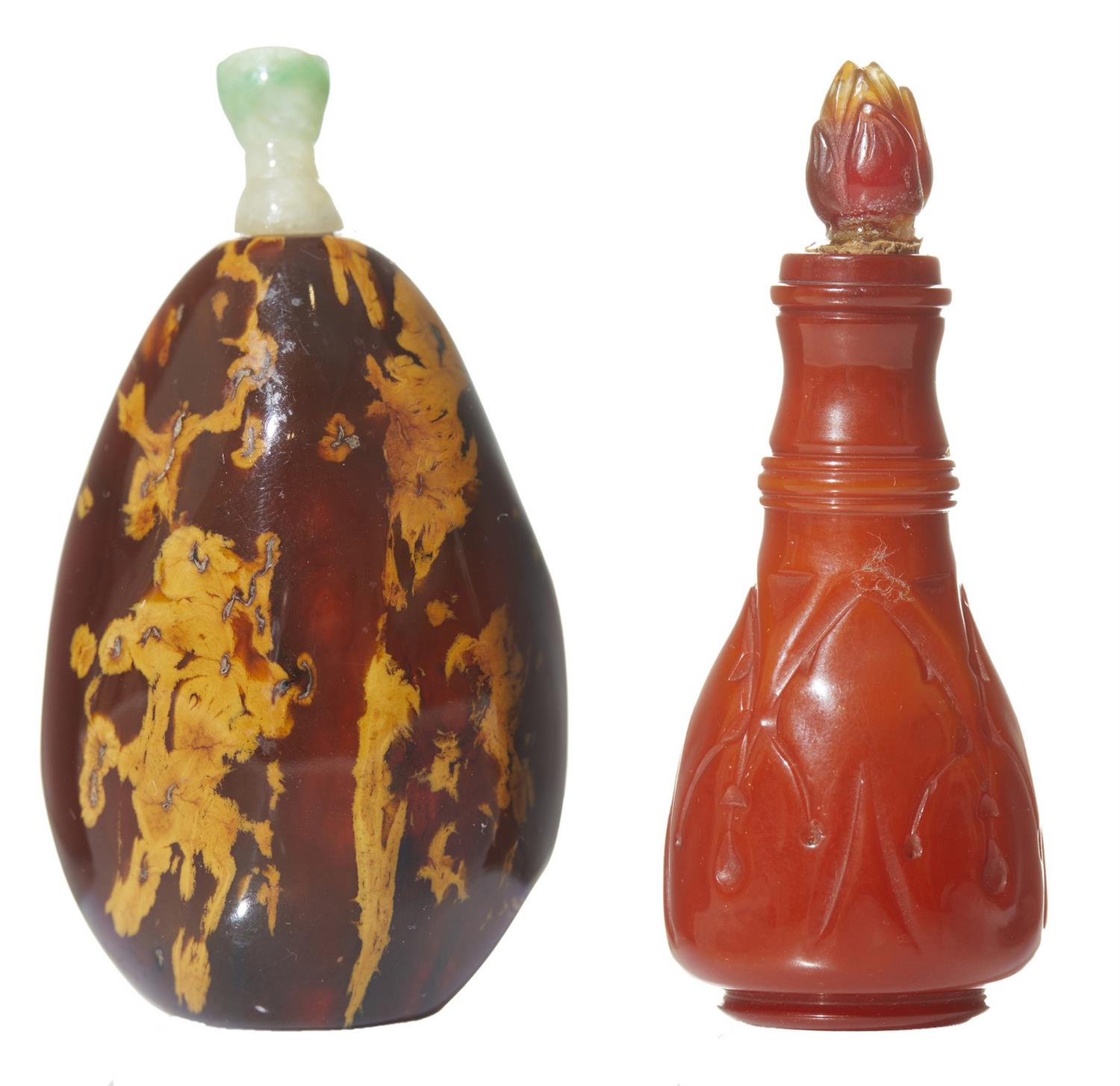 One of a pod shape with pale green jade stopper, the other with stylised floral carved decoration.
