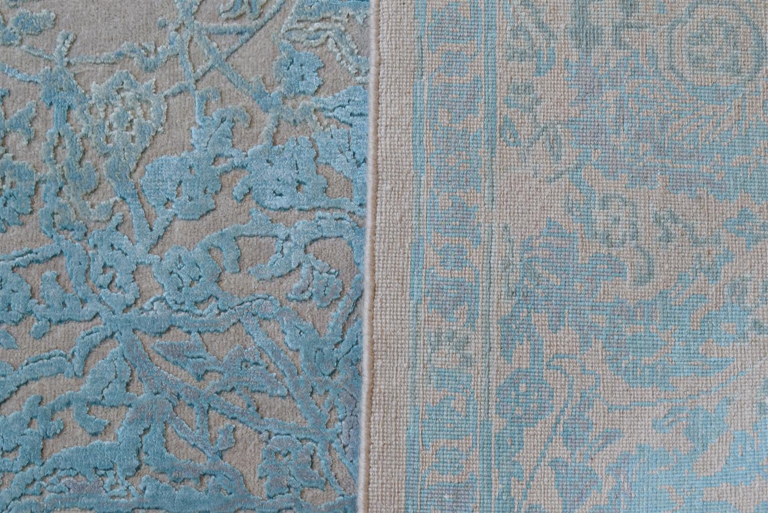 A BRAND NEW FINELY HAND KNOTTED MODERN TRANSITIONAL ERASED DESIGNER CARPET, DENSE WOOL PILE AND TENCEL SILK IN MAGNIFICENT CONDITION, MODERN DESIGN OF ERASED EMBOSSED FLORAL PATTERNS AND WIDE BORDER OF BOLD FLORAL MOTIFS, ALL IN TONES OF CREAM AND TURQUOISE, SIZE 366 X 276 CM, ORIGIN INDIA, RRP $12,500