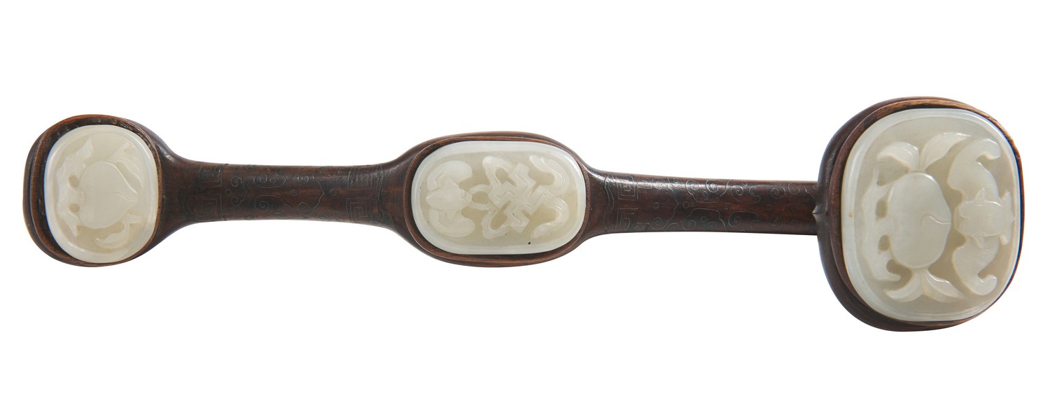 The silver inlaid hardwood sceptre inlaid with white jade plaques decorated with bats, peaches and Buddhist symbols, with original fitted silk brocade stand.