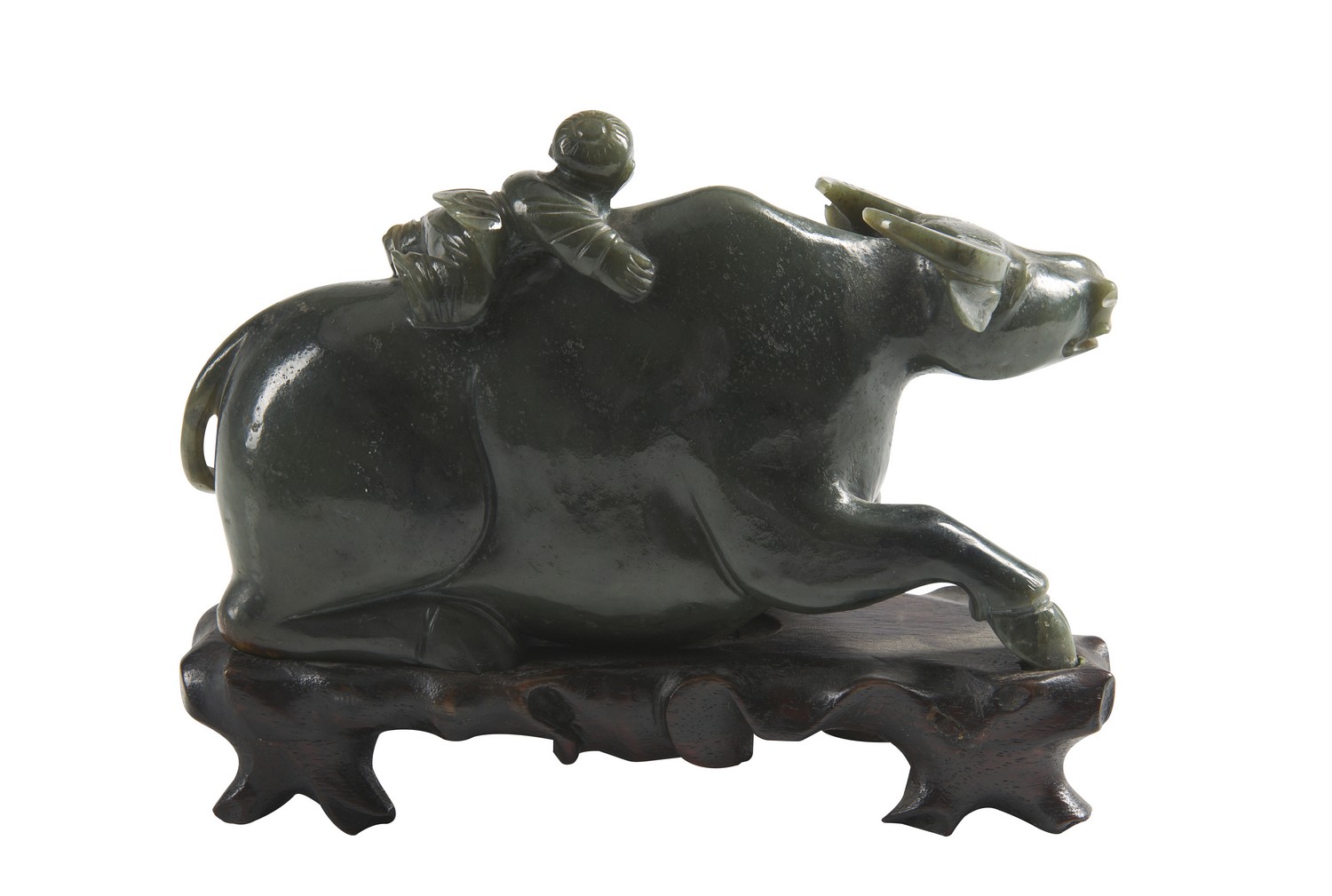 Modelled as a boy on the back of a recumbent buffalo, the jade of dark greyish green colour with russet skin showing to the front. Together with a fitted hardwood stand.