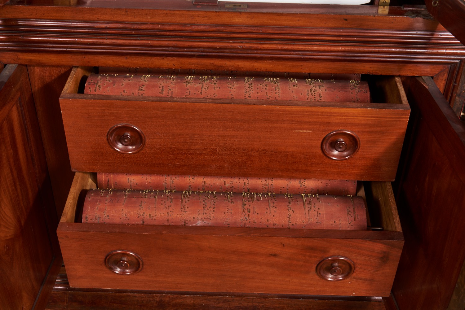 A rectangular mahogany cabinet with a pair of glazed doors to the upper section, providing access to the organ above a pair of blind panelled doors to the lower section. Behind the lower doors three full width drawers each with holders for two music barrels for the organ. Music mainly by Rossini. Weight driven movement with spiral action controlling bellows and supplying air to thirty two wooden pipes.