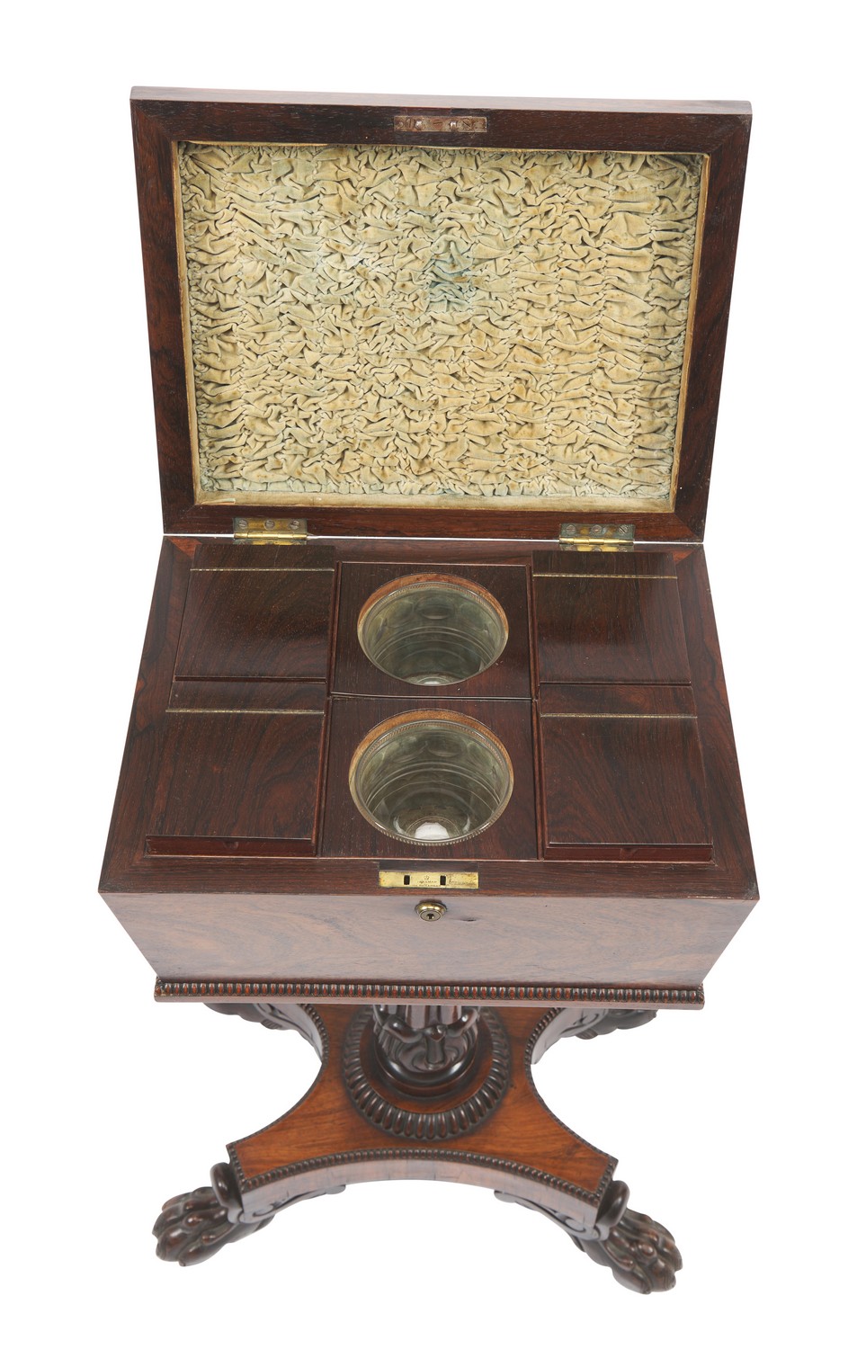 Of sarcophagus form, the hinged top lined with beading and opening to a fitted interior, comprising four square lidded canisters with tin lining, flanking two central glass inserts, the whole raised upon a carved pedestal and a gadrooned platform base, terminating on four claw feet.