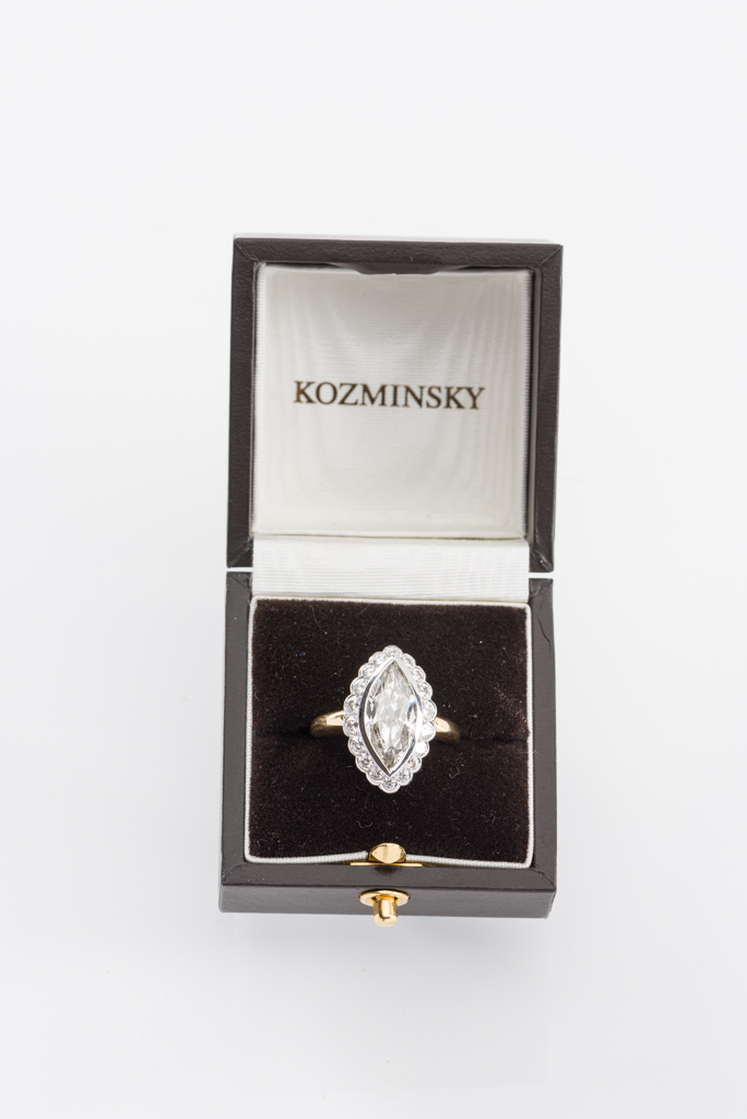 Comprising a central marquise diamond weighing 2.34cts, surrounded with eighteen graduating brilliant cut diamonds, in two tone 18ct gold, ring size P.