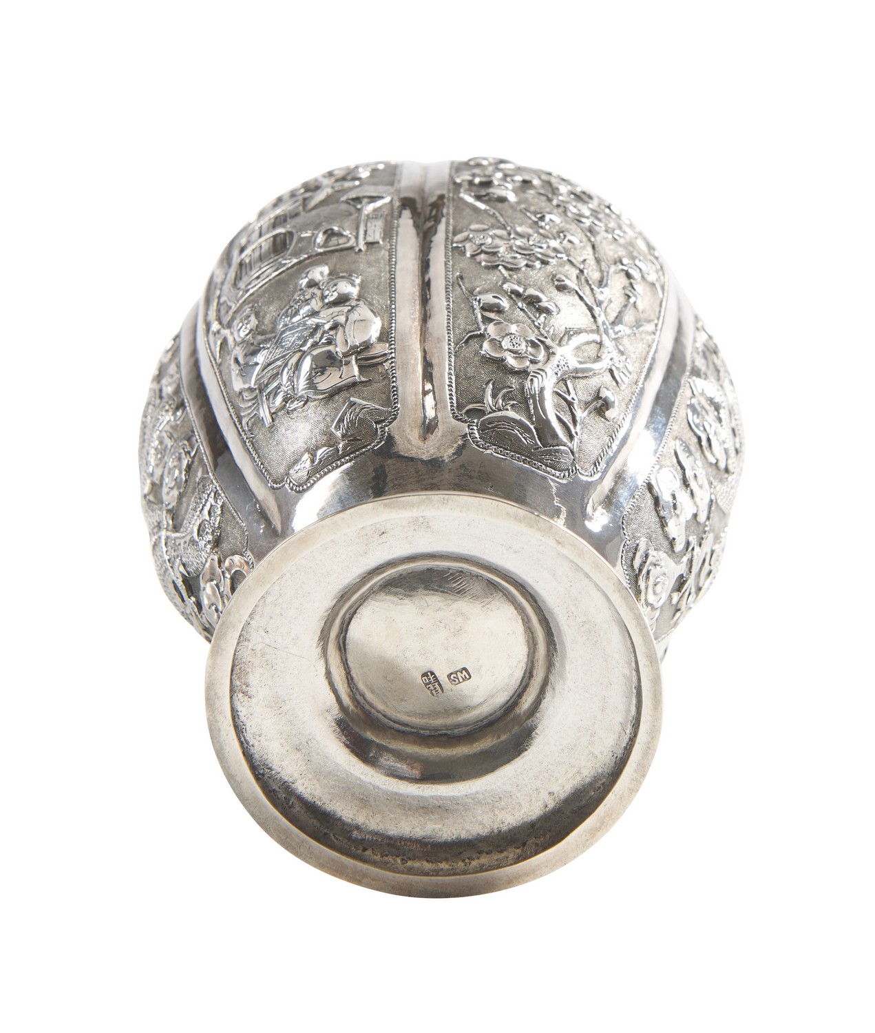 Decorated to the sides with alternating panels of flowers, dragons and landscapes in fine repousse work. Retail mark for Wo Shing, Shanghai.