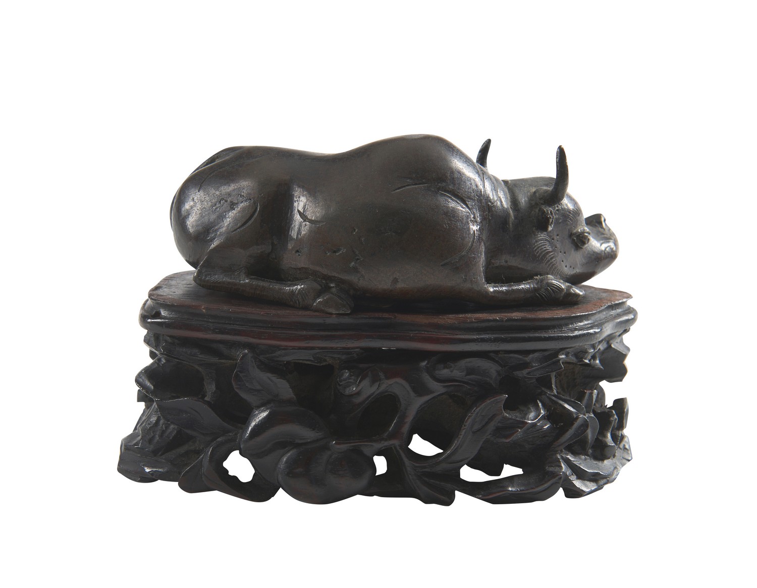 The scroll weight modelled as a recumbent buffalo with deep brown patina, with an associated hardwood stand.