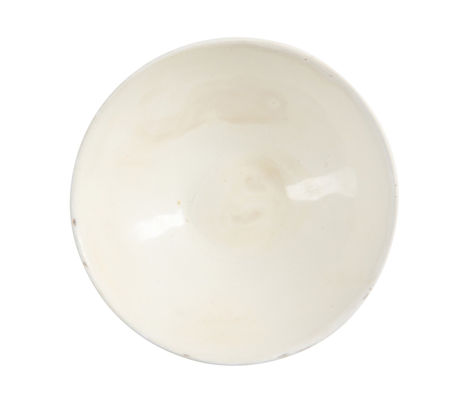With a slightly inward curving mouth rim, covered in a white slip and clear glaze.