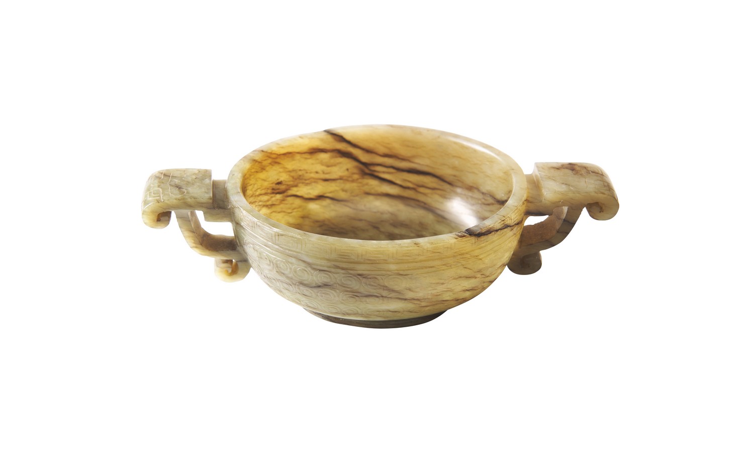The jade of grey-green hue with black veins, relief carved with archaistic s-scrolls, with twin handles in the form of archaistic dragons.