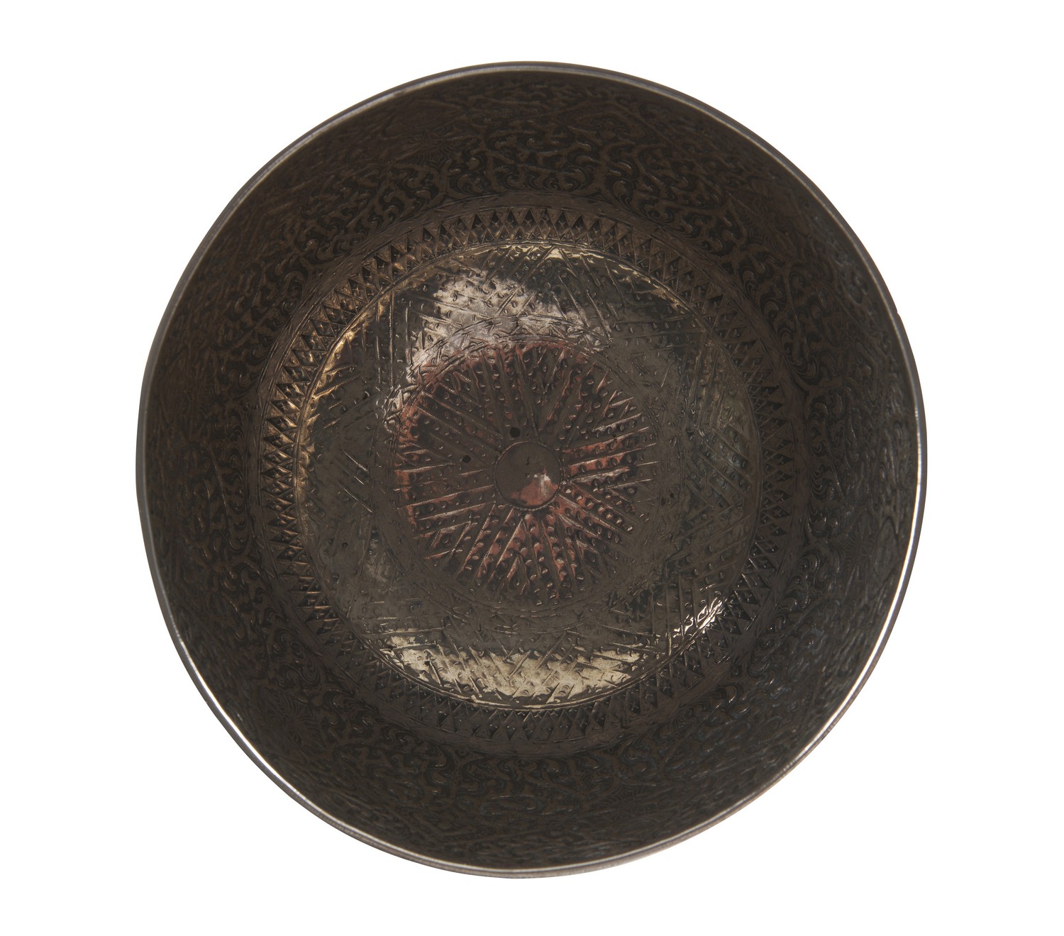 The large high-sided bowl with repousse decoration of praying figures and scrolling foliage. Marks to base including '90'.
