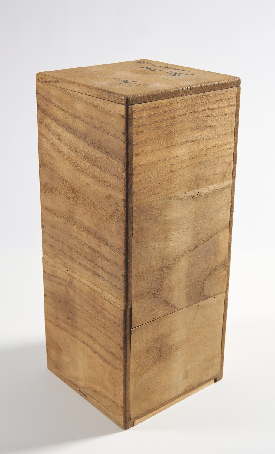 The square vase covered in an iron brown glaze with large abstracted phosphatic splashes down the sides, referencing Chinese Lushan phosphatic wares. Impressed Rokubei mark to the base. Together with tomobako (original signed wooden box) and original sealed cotton wrapping cloth.