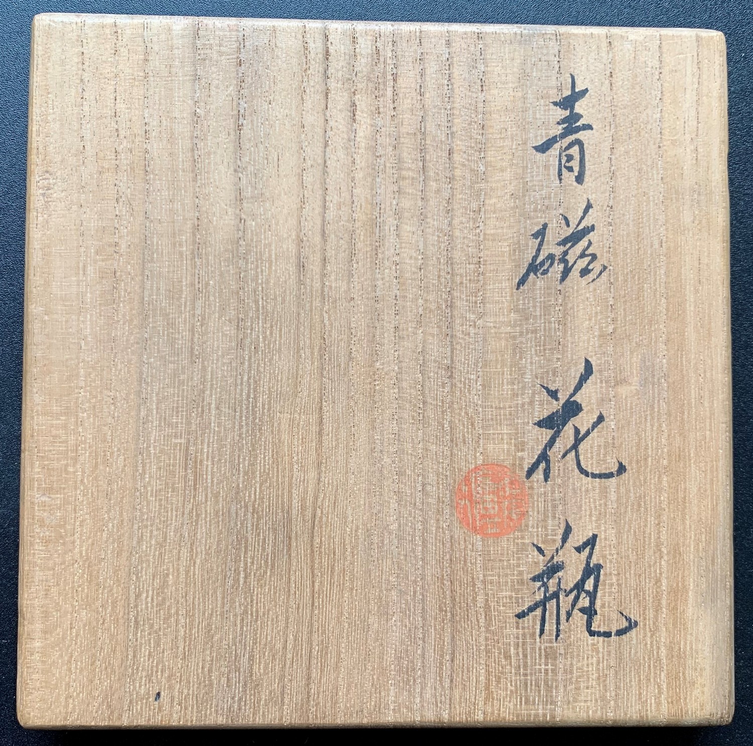 Covered in an even blue-green celadon glaze. Carved two character mark to the base reading 'Seifu'. Together with tomobako (original signed wooden box).