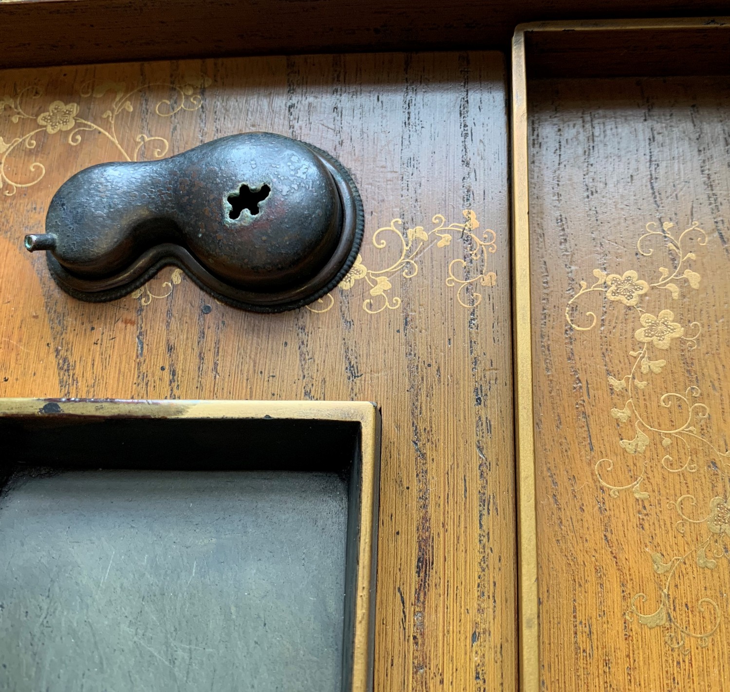 Chip to the base of the ink stone. Minor splitting to some edges of the suzuribako lid.