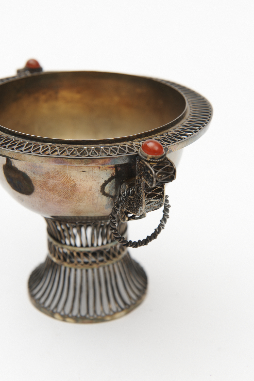 A CHINESE STERLING SILVER CUP AND COVER WITH FINE FILIGREE AND ENAMEL LID DECORATED WITH SEMI-PRECIOUS STONES, LATE QING DYNASTY, STAMPED 'SILVER' ON THE BASE, 14CM HIGH
