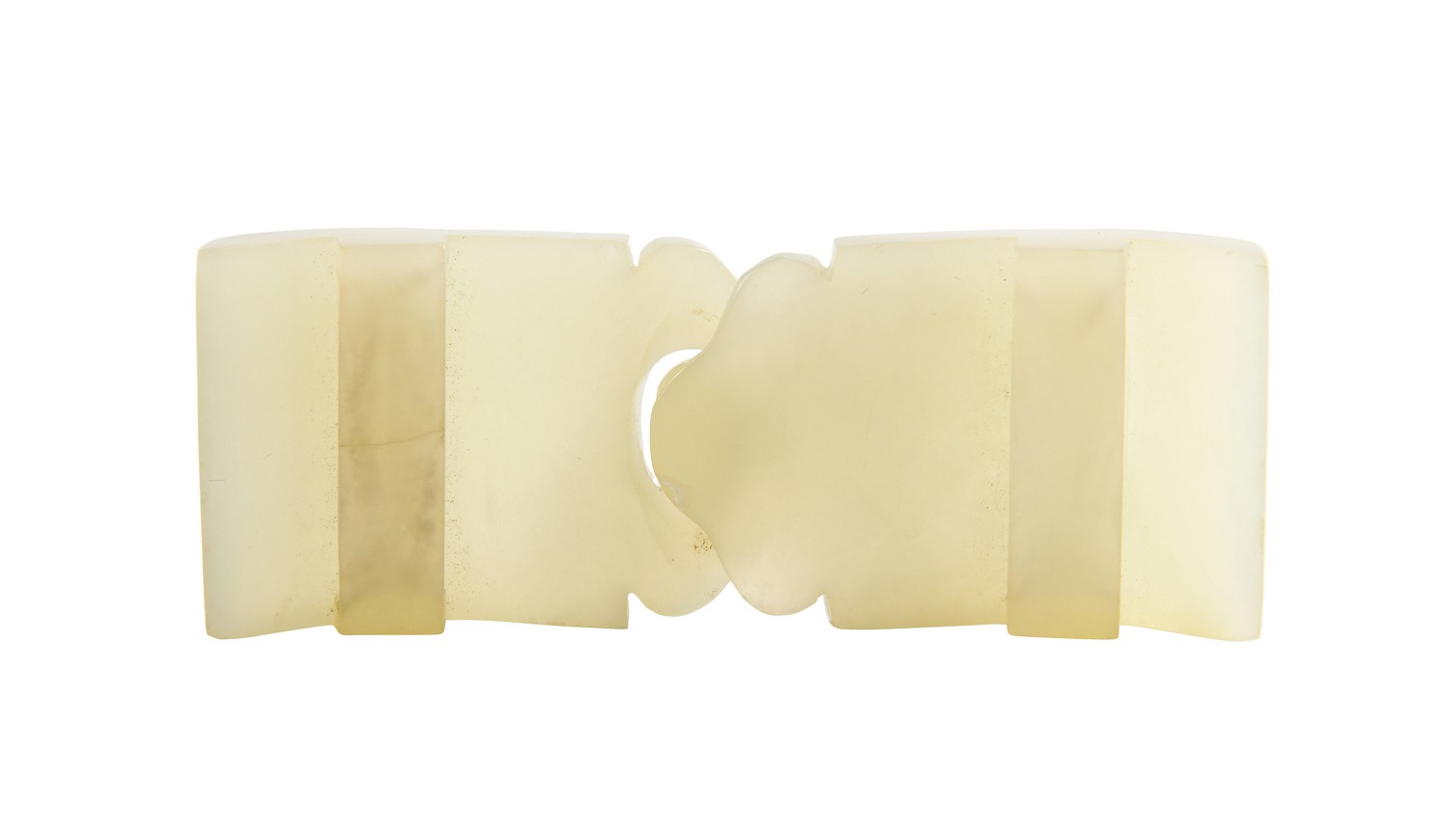 Of even-toned pale celadon jade, consisting of two square arched buckle components, with a hook in the form of a qilong head and a loop.