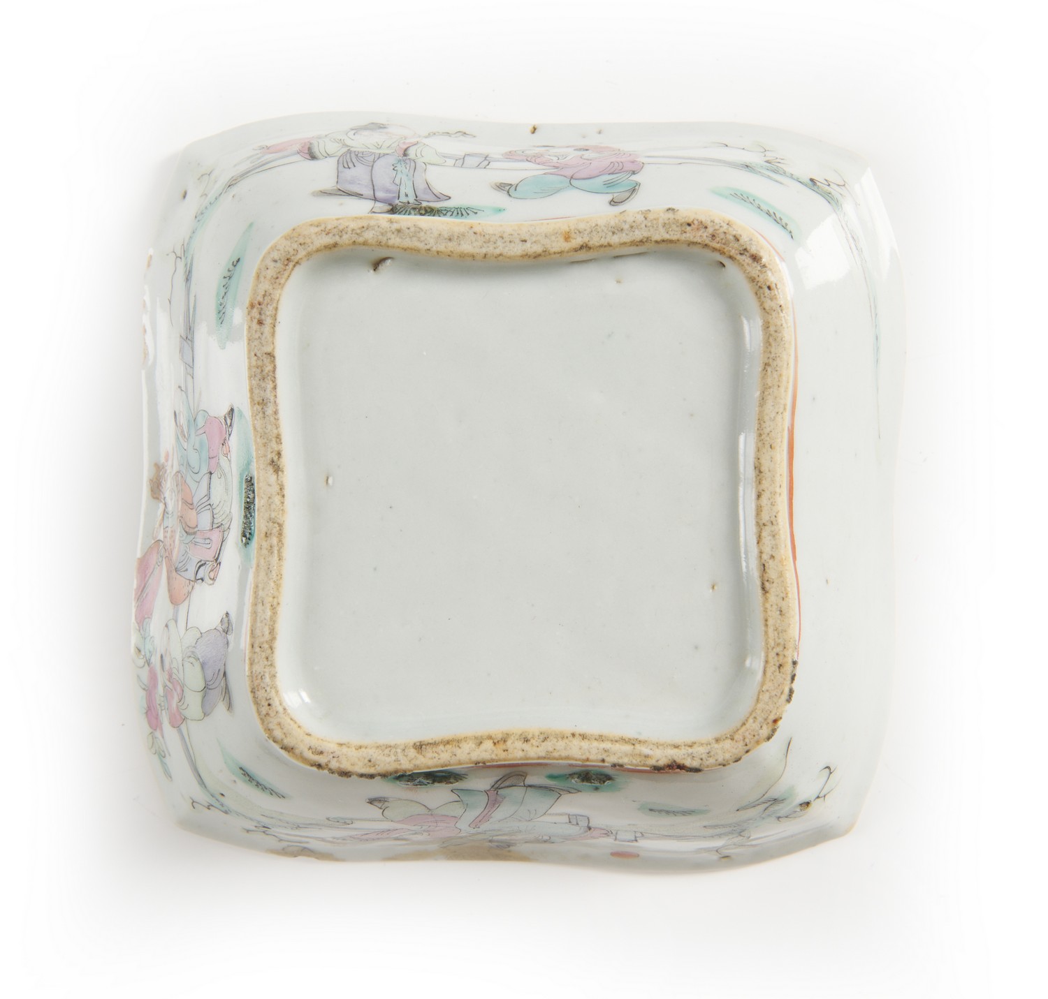 The shaped famille rose dishes fitting together to form a square in a fitted hardwood tray.