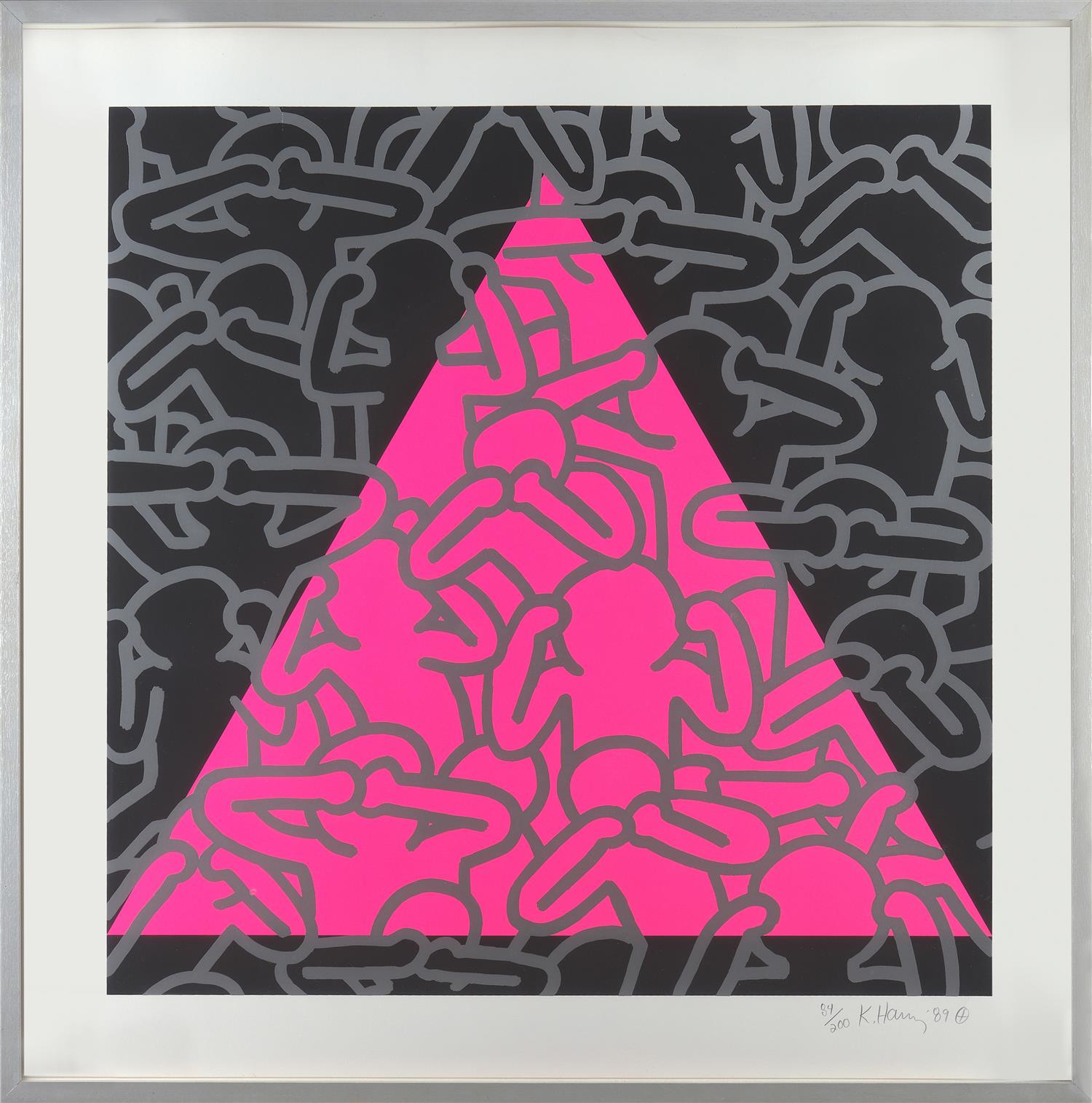 Keith Haring was diagnosed with AIDS in 1988. In the last year of his life he worked to produce imagery surrounding the social activism of the AIDS crisis. Silence = Death is an adaptation of a poster made by a collective of the same name that would eventually become the defining image for ACT UP, an organization created to fight for visibility and an end to the AIDS crisis.