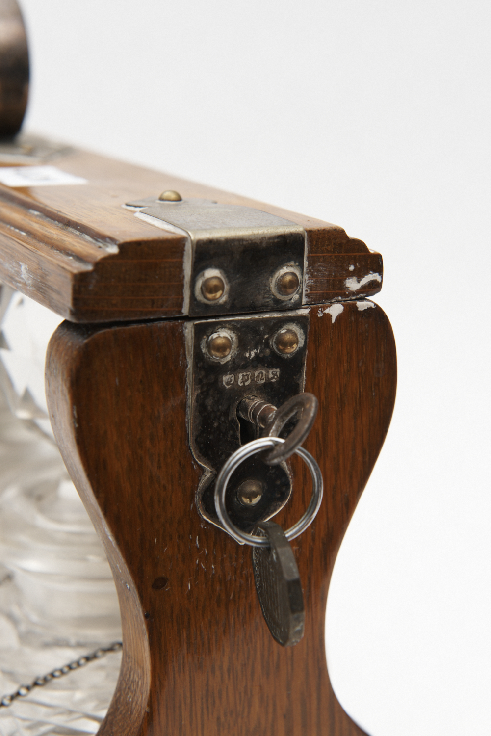 AN OAK CASED THREE BOTTLE TANTALUS WITH KEY, WITH STERLING SILVER DECANTER LABELS FOR GIN, BRANDY AND WHISKEY - (A/F, KEY BROKEN AND TANTALUS FRAME LOCKED)