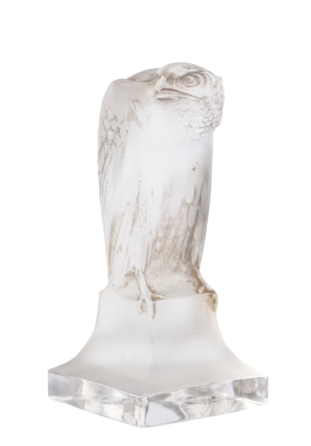 The eagle seal lifts out to reveal a small cavity, fitted with an inkwell liner, all housed in a fitted, stepped and frosted glass base. Etched signature to side of eagle seal.