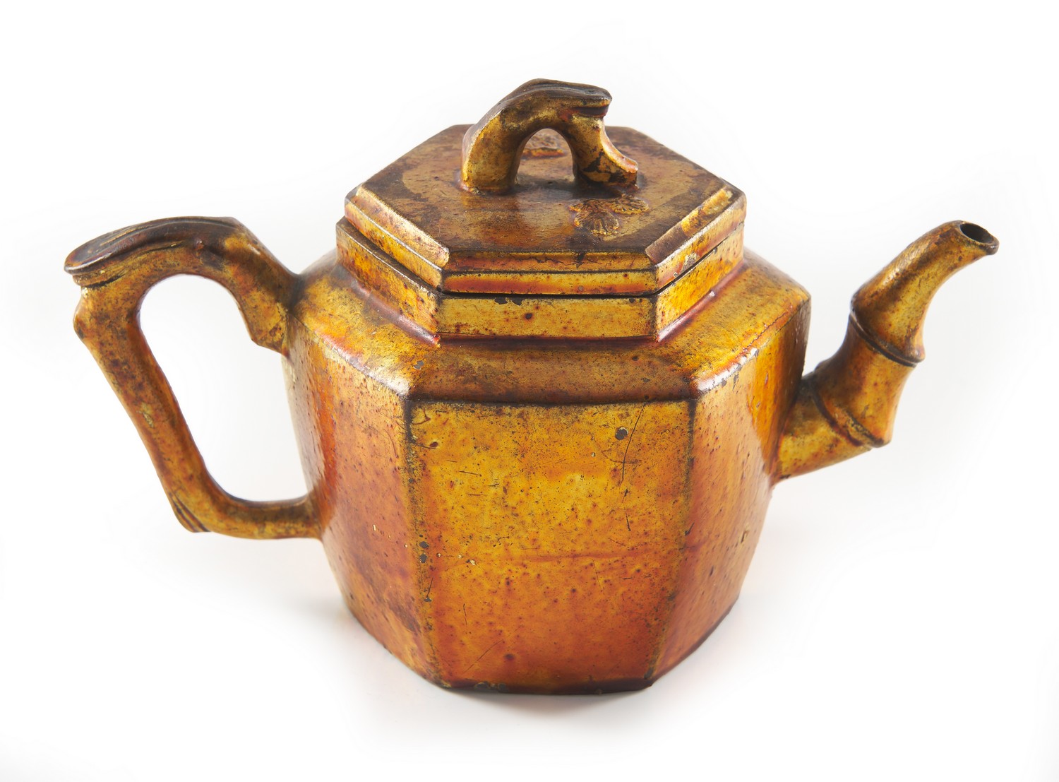 The hexagonal section teapot with peach blossom decoration to the handle, covered in gold lacquer. No mark to the base.