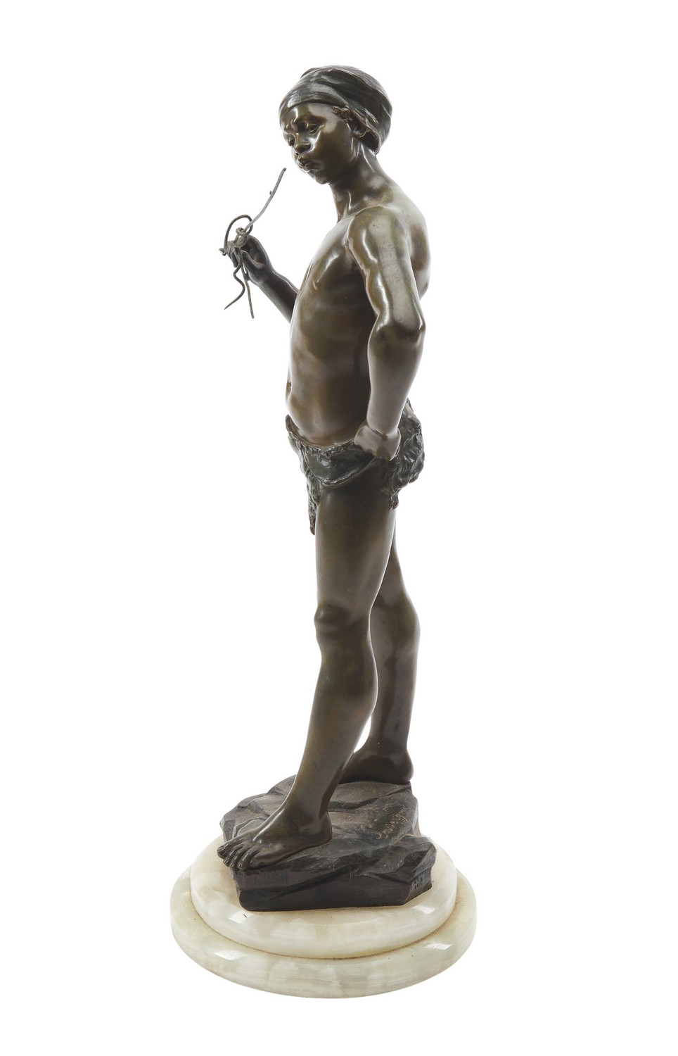 Modelled as a young snake charmer, a youth wearing only a loincloth and a turban, holding a stick with a small coiling snake (the original snake missing). All mounted on a graduated marble base. Signed Lavergne to base.
